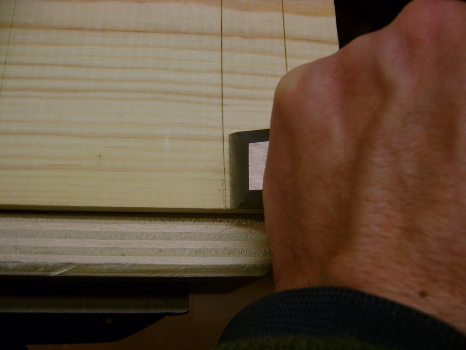 L’altra mano terrà il coltello che cerchera’ con la punta della lama la base di contatto tra il legno e la squadra. Il coltello dovrebbe essere impugnato leggermente inclinato così da compensare lo smusso della lama stessa e garantire la perpendicolarità della traccia.