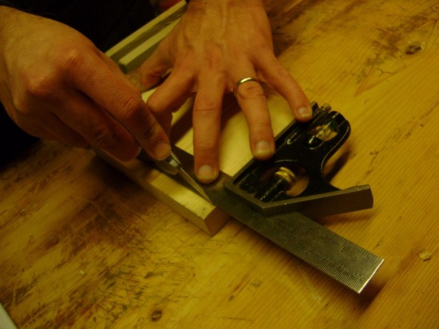 At first, it’s a bit difficult to keep everything in place, but with a bit of practice it will be natural.The other hand will hold the knife searching with the tip of the knife the intersection of the beam with the face of the piece of wood. Knife should be slightly inclined to compensate for the chamfer of the blade itself and to ensure the perpendicularity of the trace. When we make a crossgrain cut (i.e. perpendicular to the direction of the wood fibra) it is useful to trace two parallel lines on all four faces of the piece of wood.
