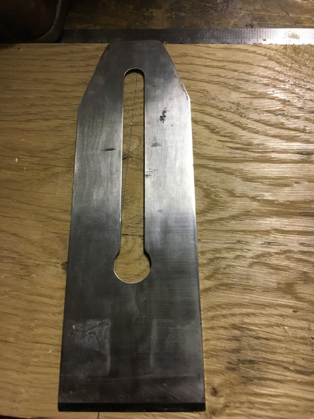 E) Lama o ferro: E’ posta direttamente sul frog e fuoriesce dalla bocca della pialla con il tagliente. Esistono vari modelli di lame variando la durezza e lo spessore dell’acciaio di cui sono composte. La profondità di protrusione della lama dalla bocca è regolata tramite la rotella posta sul retro del frog, così come l’angolo di presentazione della lama può essere variato spostando la leva di regolazione laterale.