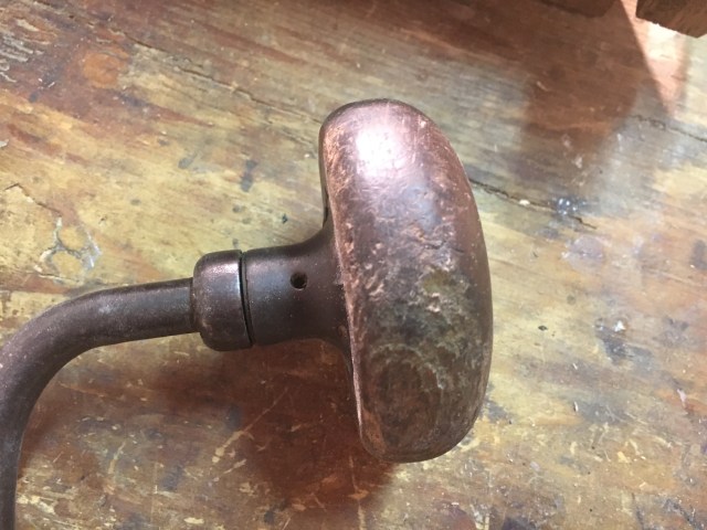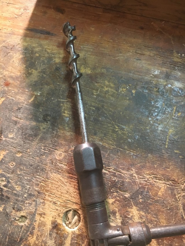 Il girabacchino viene utilizzato con ambedue le mani ed il suo funzionamento è molto semplice ed intuitivo. Con una mano si impugna il pomello superiore e con l’altra mano il manico in legno posto nel corpo dell’utensile. Quindi con un movimento rotatorio in senso orario la punta affonda nel legno praticando il foro. In senso antiorario la punta si ritrae. Durante il movimento bisogna esercitare un pò di forza con le braccia e con le spalle aiutandosi anche con la tutta la parte superiore del corpo che spesso funge da appoggio all’azione dell’utensile. Con l’esperienza verrà comunque naturale controllare e bilanciare tutte queste forze. Come dicevo sopra la sua manutenzione è minimale. Bastano poche gocce di olio per meccanica da inserire negli appositi fori, uno posto sotto al pomello in legno ed uno vicino al meccanismo di trasferimento del movimento, per ottenere una lubrificazione ottimale (vedi foto sopra). Quando si pratica un foro nel legno bisogna prima considerare alcune cose. È buona norma usare sempre punte ben affilate, dritte e senza ruggine. I pomelli in legno devono girare senza alcun ostacolo e le punte devono essere inserite saldamente nelle ganasce.