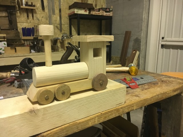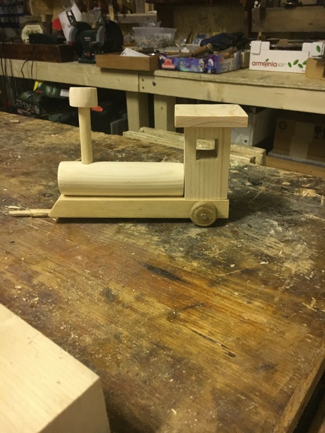 Partendo da un blocco di legno di abete ricavato da un vecchio pallet ho dapprima provveduto a piallarlo ed a squadrarne le superfici. In seguito ho cominciato a sezionare le basi dei vagoni (cinque vagoni compresa la locomotiva). Tutti i vagoni sono della stessa lunghezza eccetto la locomotiva che è leggermente più lunga ed il vagone carbone che è leggermente più corto. La locomotiva è composta da tre parti fondamentali: la base, la cabina e la caldaia. Ho aggiunto quindi la canna fumaria con il comignolo opportunamente sagomato, il fronte del vano caldaia (si vede nelle prossime foto) e smussato la base per rendere l’effetto di locomotiva spartineve. Quindi ho scavato una mortasa per creare la finestrella della cabina, incollato il tetto della cabina stessa e sagomato le ruote ricavate da dei pezzetti di legno duro (mogano) avanzati da precedenti lavori. Le ruote sono montate su degli assi fatti in legno opportunamente sagomati e fatti passare all’interno della base. La foratura praticata all’interno delle basi è leggermente più larga del diametro degli assi così da permettere la rotazione degli stessi e quindi delle ruote che altrimenti non potrebbero girare. Le ruote, solo per la locomotiva, sono di tre grandezze diverse.