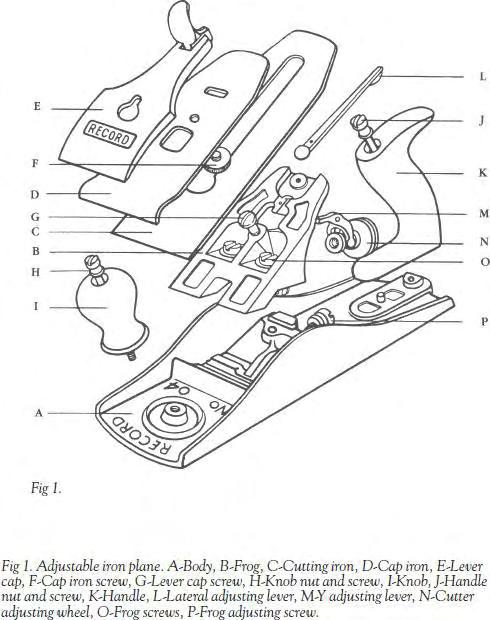 Meglio cercare pialle prodotte antecedentemente alla seconda guerra mondiale, marcate Stanley o Record. Verificare con attenzione se tutte le parti della pialla sono presenti. La mancanza anche di una sola vite può successivamente creare problemi per la difficoltà di reperimento ed onerosità di spedizione rapportata al suo oggettivo valore. In questo caso può aiutare, almeno i primi tempi, avere a portata di mano un esploso della struttura di una pialla così da poterlo confrontare ed attualizzare. Nella figura 1 tratta dal libro The Essential Woodworker di Robert Wearing è raffigurata la struttura di una Record n.4 confrontabile con l’originale nella foto subito sopra (per comodità ho inserito anche una traduzione in italiano). Una volta verificato che la pialla sia completa nelle sue parti possiamo controllare la qualità e la vita residua della lama. Una lama originale e con tanta vita residua (verificabile guardando la lunghezza del ferro) è sicuramente da preferire. Le condizioni dei manici sono importanti, soprattutto la loro solidità e tenuta. Meglio se sono in legno e se non danneggiati o scheggiati. Queste piccole imperfezioni non inficiano solitamente la dinamica della pialla ma la successiva opera di sistemazione, se si decide di effettuarla e seppur non difficoltosa, richiederà comunque del tempo da dedicare. Sovente si rende necessario procedere al loro smontaggio e accorciare la vite che passa all’interno così da garantirne una rinnovata tenuta. Un elemento fondamentale da verificare con accuratezza invece è la condizione della suola e dei fianchi del corpo pialla. Devono essere assolutamente privi di fratture, crepe o spaccature, specialmente vicino alla bocca da dove fuoriesce la lama. In generale, poi, bisogna accertarsi delle buone condizioni del controferro, del lever cap, della vite di profondità (meglio se in ottone) e della leva laterale. Da preferire inoltre le pialle che presentano un frog pieno. In linea di massima, se i pezzi sono tutti presenti, gli eventuali difetti (con l’eccezione dei danni alla suola di cui dicevo prima) possono essere facilmente risolvibili con un pò di pazienza e tempo a disposizione. L’affilatura del tagliente e del controferro è sempre da mettere in conto, così come la spianatura della suola e dei fianchi del corpo pialla. La mancanza di vernice (japanning) dal corpo pialla, i manici da riprendere e la presenza di tanta ruggine sono la normalità in questo tipo di pialle e secondo me ne denotano addirittura la buona qualità, perchè dimostrano che sono state utilizzate a pieno regime per molto tempo (ruggine compresa).