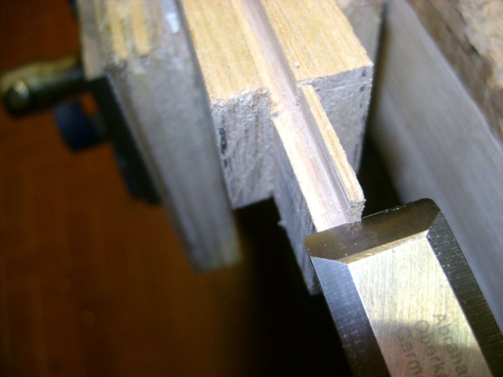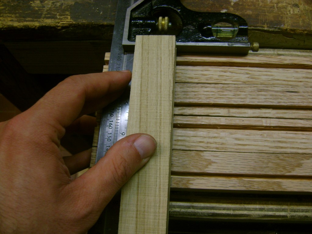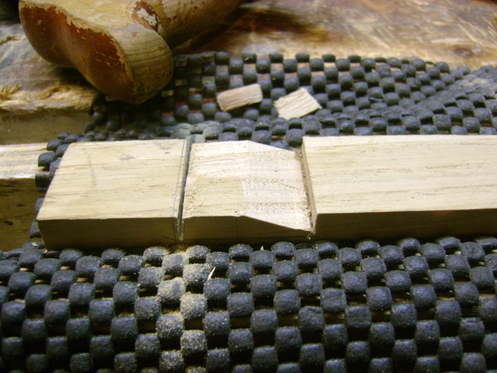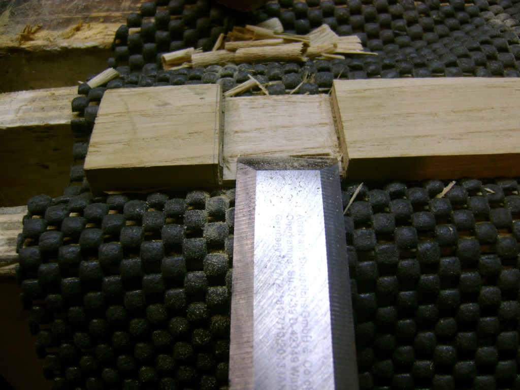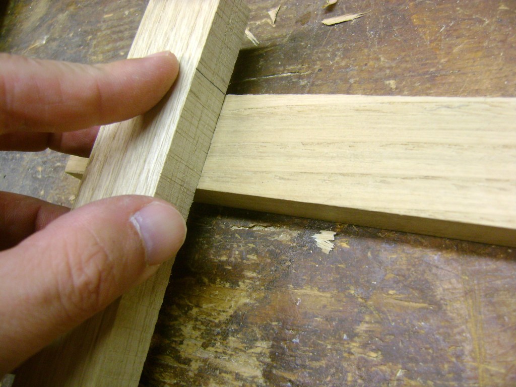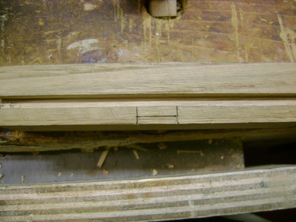 Sopra: operazioni di tracciatura e scavo ed incastro dei pezzi che formeranno lo sportello superiore della lanterna. I pezzi si incrociano a mezzo spessore.