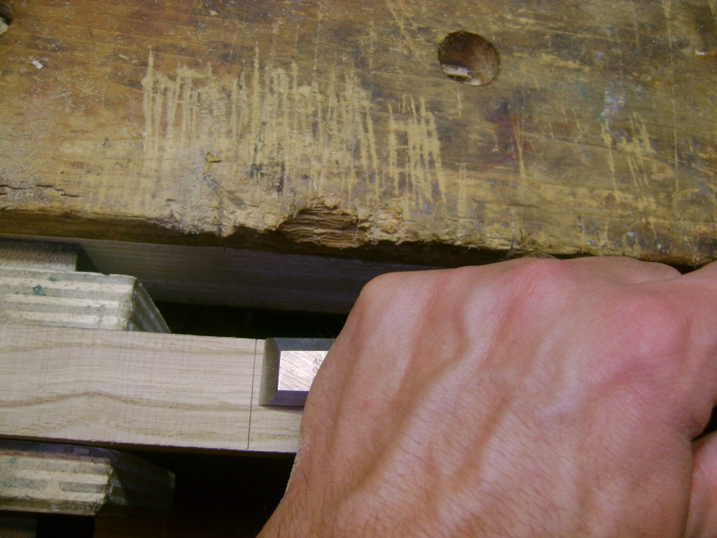 Sopra: tracciatura, taglio e rifinitura dei tenoni dei montanti.