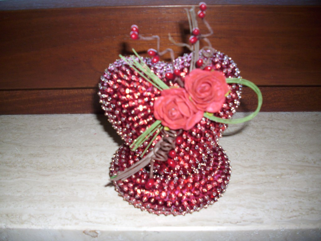 A heart of polystyrene with red sequins, transparent beads and golden pins finished with two flowers …. to wish a happy holyday to all mothers !!