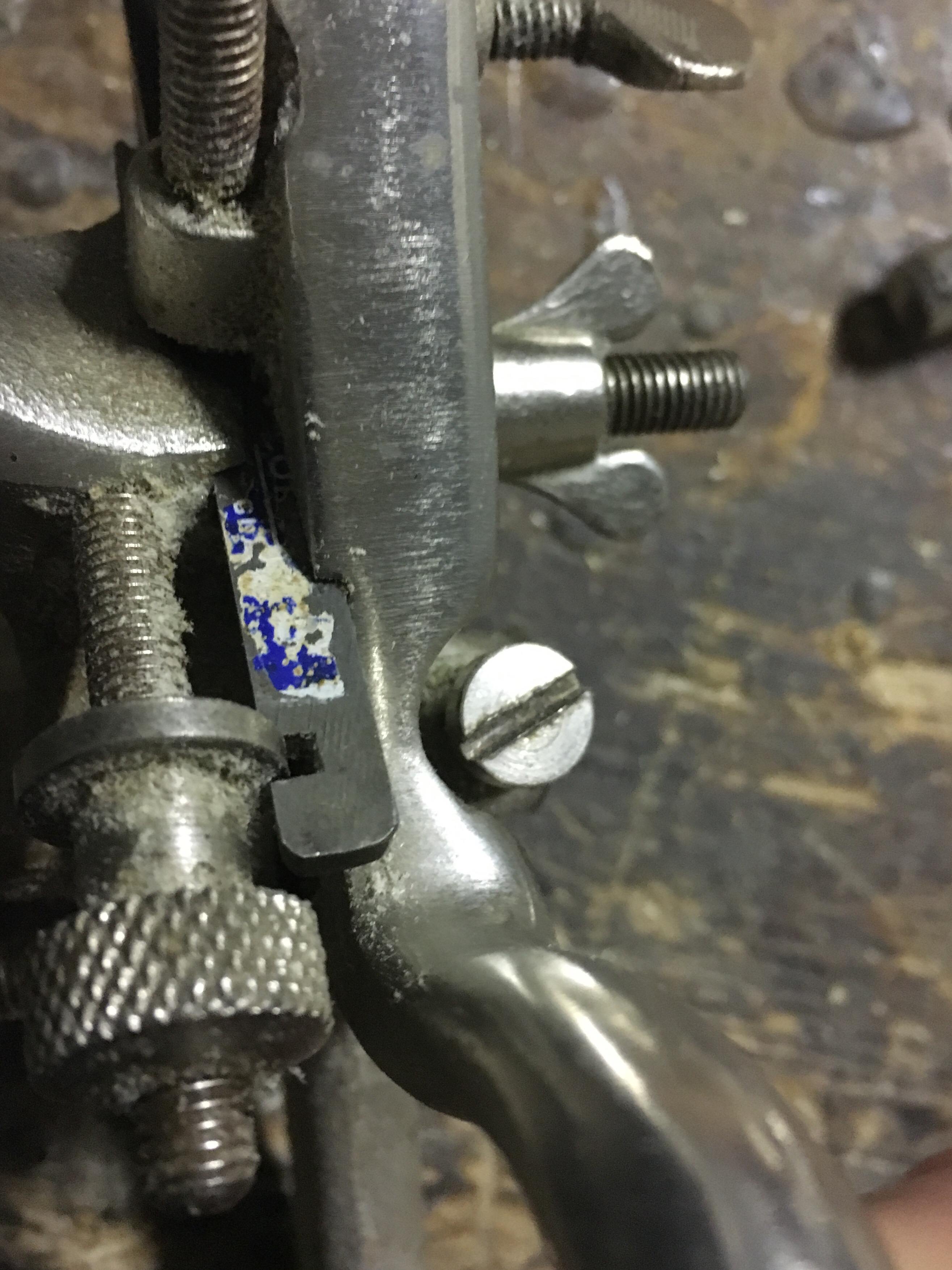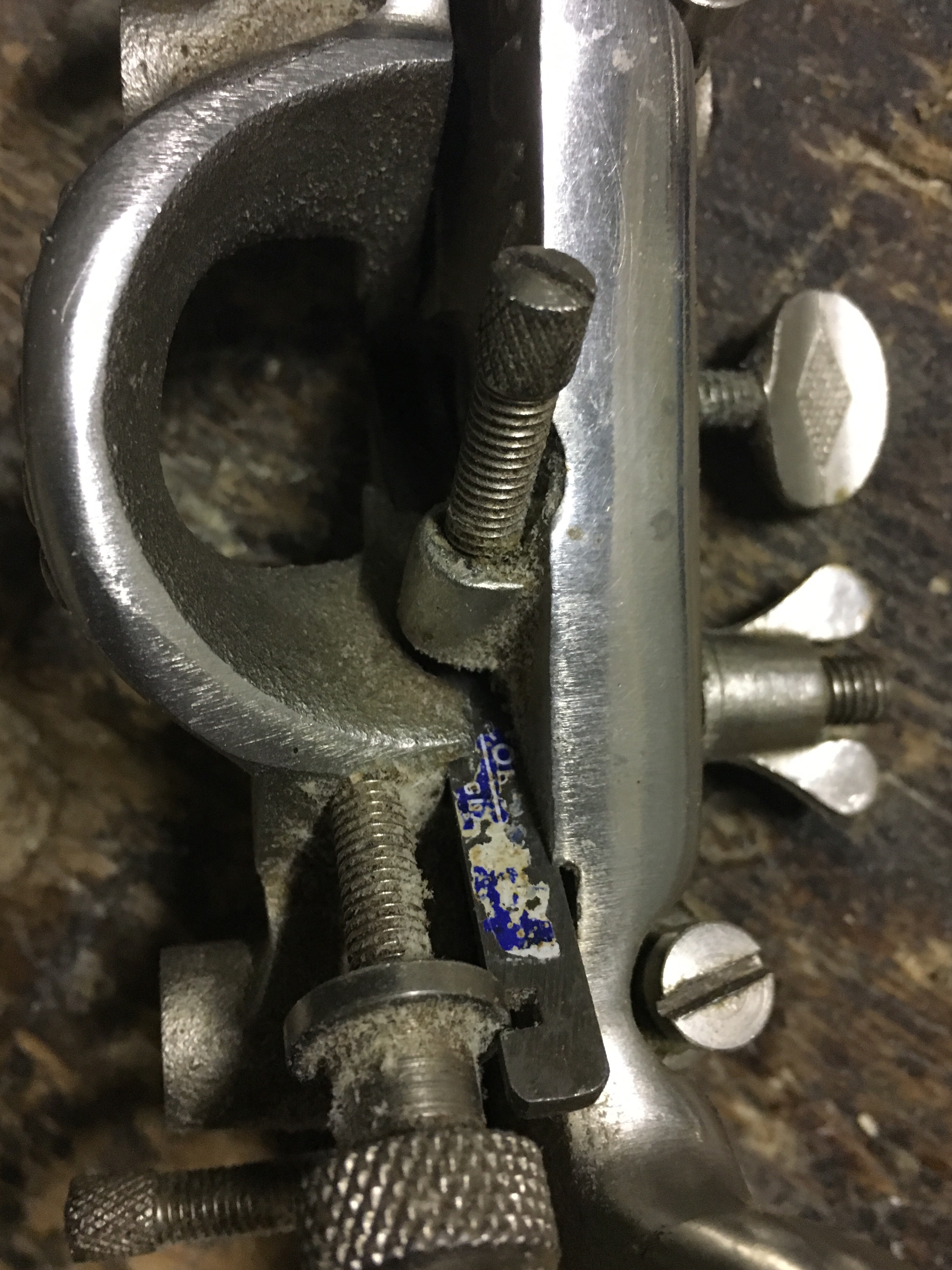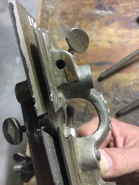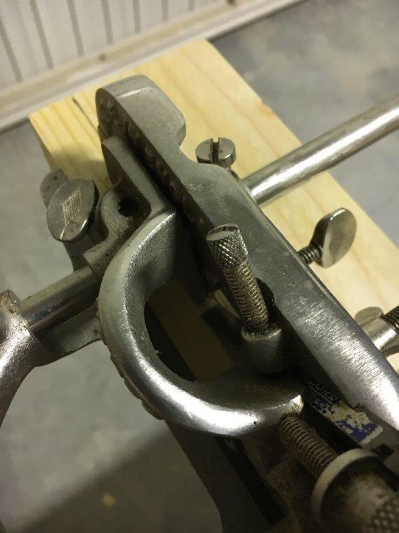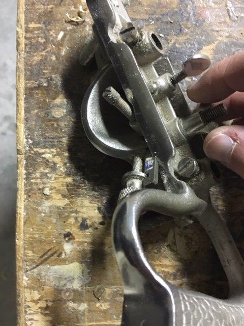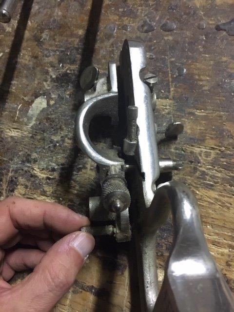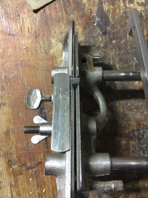 D) the depth gauge is a metal base (removable) that allows the predetermination of the groove depth. It flows on a metal cylinder and is blocked by a wing screw. Operation is simple. During the planing action the plough plane goes down as it progresses into the groove. When the base will come into contact with the workpiece this will not allow the blade to cut further.