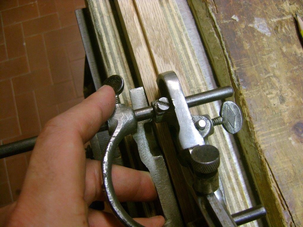 It starts from the furthest point in front of us at about 10 cm. from the end of the piece to be worked and start with a short and light pass to establish a first light groove in the wood. If we are satisfied with the position of the groove proceed with backward movements always making small passes to establish a first light groove along the entire surface to be worked. As soon as we have defined the walls of the groove we will be able to deepen the blade, obtaining more consistent shavings and therefore greater speed in the work. We proceed until we reach the established size with the stop of depth, which touching the wood, will prevent us from going further. During processing, it will be necessary to release the plough plane throat frequently from the shavings that are expelled upwards, unless the deflector is being used. Remember that plough plane do clog frequently. It is also important from time to time to check the status of the groove being created, which should result with the walls and bottom perpendicular and straight between them. If the groove came with the bottom not flat or with the crooked walls it would then be difficult to insert the eventual paneling. The choice of the blade is important. The groove is created of the same width and shape as the cutting edge of the blade. Only if we want to create a shoulder in the wood should we choose a blade with a width greater than the measure we want to create. If we have to work across the grain, we can help with the spurs, as mentioned above. It should however be said that a normal tracing knife can do the same work as the spurs. During the ploughing of the groove we can meet some difficulties related more to reverse grain or the presence of knots. The plough plane will tend to jam and tear the fibers. In such cases it may be useful to define the intersection between the walls and the bottom of the groove with a small knife or a fine saw or, if the groove is just started, define the shape with a gauge, better those with a cutting wheel. In this way we can separate the fibers and the planing action will result easier. Another precaution is to verify that there is parallelism between the fence and the sliding section (or the plane body). It would be better if the distance between the guides in the opening part is slightly narrower (about 1 mm.) than the distance at the rear end. If this were not so, planing would become very difficult or even impractical. To avoid this problem, the screw that holds the rear part can be kept loose.