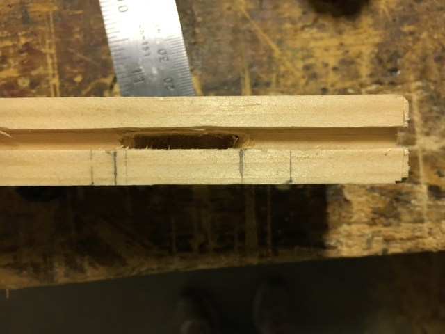 Poniamo la punta dello scalpello tra le cime delle punte del truschino (non alla loro base, altrimenti la mortasa verrà troppo larga) e, con l’ausilio di un righello, stabiliamo la distanza che la mortasa dovrà avere dalla faccia del pezzo da unire. In questo caso la mortasa verrà effettuata centralmente rispetto allo spessore del pezzo.