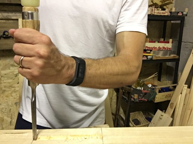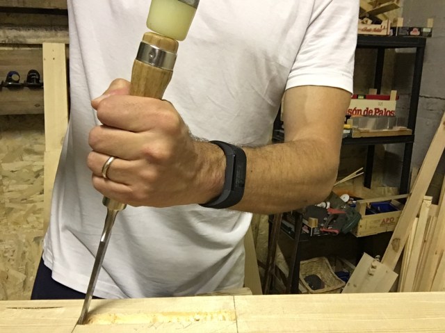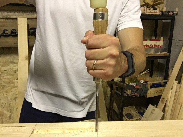In the photos above the mortise processing sequence is shown.With the chisel we begin to chop starting from about 1 mm from the traced limit and with the bevel facing the direction in which we are working. The chisel must be kept as perpendicular as possible with the mortise walls in order to prevent them from being tilted (figure 1).