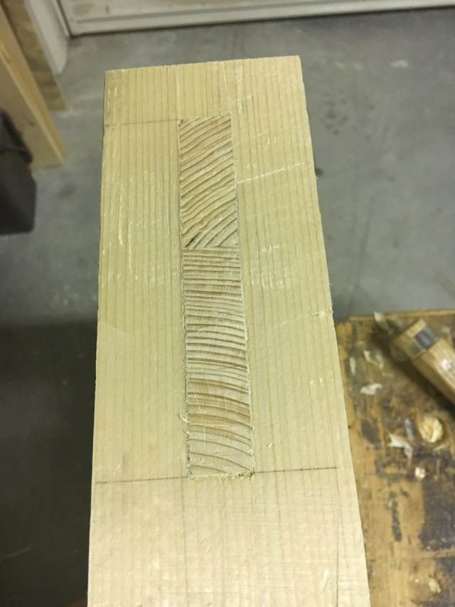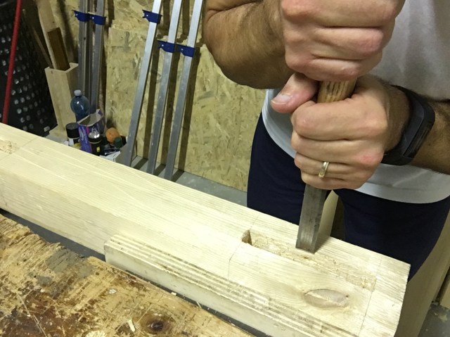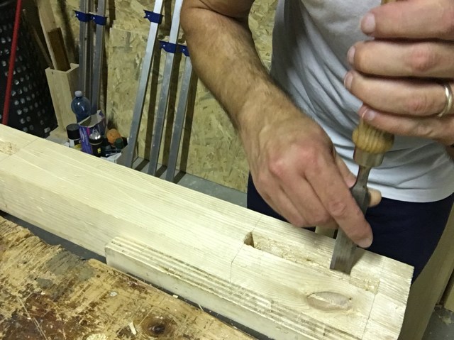 Di seguito un altra variante di tenone e mortasa (con anca) molto utilizzata nel fare ad esempio le gambe dei tavoli o le cornici delle ante dei mobili (le foto sono tratte da un altro progetto). In questo caso la mortasa non è scavata a tutto spessore ma solo fino a circa 2/3. Per mantenere la perpendicolarità dello scalpello mi sono aiutato con un supporto autocostruito.