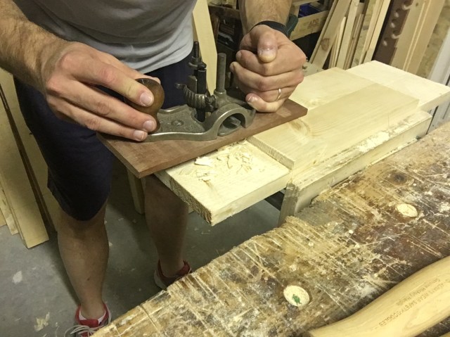 Lavoriamo con la pialla mantenuta a 45 gradi da entrambe le facce del tenone e rifiniamo con la carta abrasiva cercando di ottenere una sagomatura uniforme. Facciamo delle prove a secco (quindi senza colla) dell’incastro. Quando saremo soddisfatti potremo passare alla fase di incollaggio.