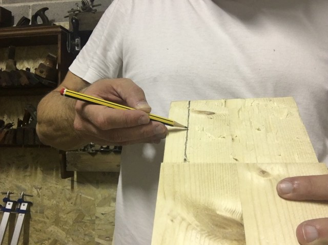 Per fare il tenone come prima cosa si traccia a matita sul secondo pezzo la misura dello spessore del primo pezzo (quello dove abbiamo fatto la mortasa) riportandolo con l’ausilio della squadra su tutte le facce del pezzo. Successivamente tracciamo con il coltellino le spalle del tenone avendo cura di tracciare solo le parti che andranno effettivamente rimosse.