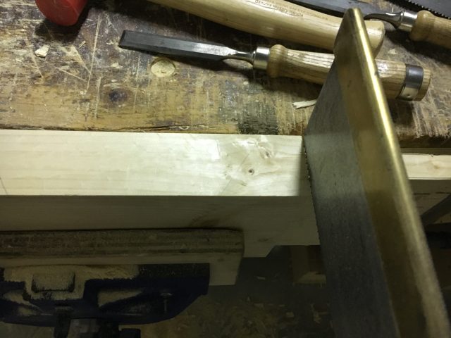 Serrando il pezzo nella morsa, seghiamo le guance del tenone partendo dall’estremità più lontana da noi e successivamente allineando la sega seguendo il più vicino possibile la traccia fatta dal truschino e segando sempre dalla parte che dovremo eliminare. La traccia del truschino deve quindi rimanere dentro ed essere sempre visibile. Cerchiamo anche di segare il più dritto possibile aiutandoci segando da ambedue le parti del pezzo a fasi alterne. Per segare le guance del tenone si usa solitamente una sega per tenoni ma niente vieta che si possa utilizzare una sega per code di rondine, specialmente per tenoni di ridotte dimensioni. Nel mio caso mi sono aiutato anche con un segaccio visto che il dorso della sega per tenoni limitava la profondità del taglio da effettuare.