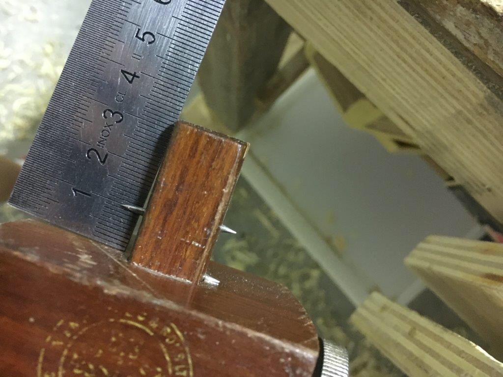 Blocchiamo il settaggio del truschino e riportiamo la misura tracciando i solchi direttamente tra le due linee precedentemente tracciate. Cerchiamo di non premere troppo forte le punte del truschino mentre è importante che sia mantenuto ben adeso lateralmente al pezzo, per evitare che le fibre longitudinali del legno lo facciano deviare dalla traccia.