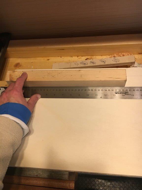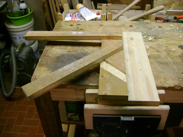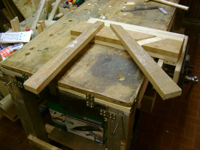 Materiale e misure: base inferiore in multistrato lunghezza 40 cm. larghezza 30 cm. spessore 1,5 cm.; base superiore in multistrato lunghezza 40 cm. larghezza 20 cm. spessore 1,5 cm.; guida laterale in legno duro lunghezza 40 cm. larghezza 2 cm. spessore 2 cm.; battuta superiore in legno duro lunghezza 22 cm. larghezza 3 cm. spessore 3 cm.; battuta inferiore in legno duro lunghezza 30 cm. larghezza 2 cm. spessore 2 cm.