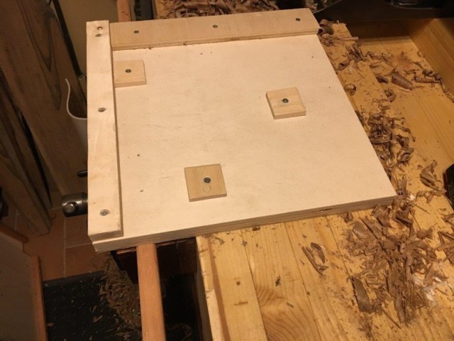 Base in multistrato lunghezza 30 cm. larghezza 30 cm. spessore 2 cm.; battuta laterale bassa lunghezza 27,5 cm. larghezza 4,5 cm. spessore 0,5 cm.; battuta laterale alta lunghezza 30 cm. larghezza 3 cm. spessore 1 cm.; battute mobili 4 cm. per 4 cm. per 0,5 cm. di spessore; battuta inferiore lunghezza 50 cm. per 2 cm. per 2 cm. Le battute laterali sono avvitate su due fianchi della base e sono di diversa altezza così da permettere un appoggio più consono al pezzo che si sta lavorando e permettere inoltre un miglior riscontro visivo mentre si pialla. Le battute mobili sono in multistrato così come le battute laterali e sono preforate al centro per permettere l’inserimento della vite senza che si spacchino visto l’esiguo spessore.