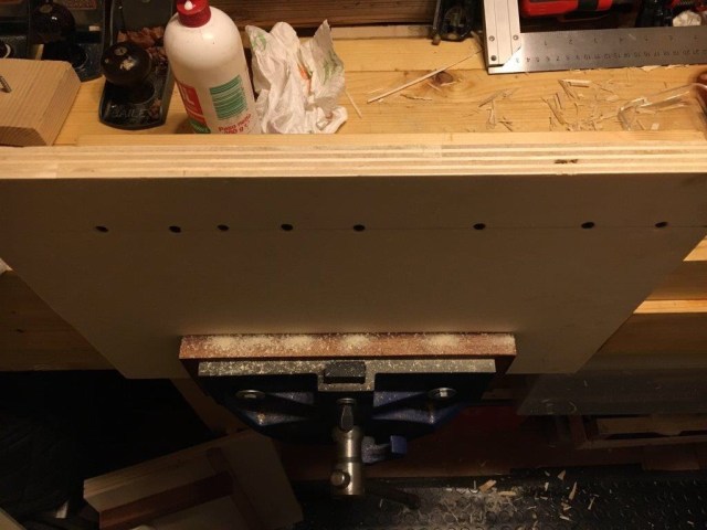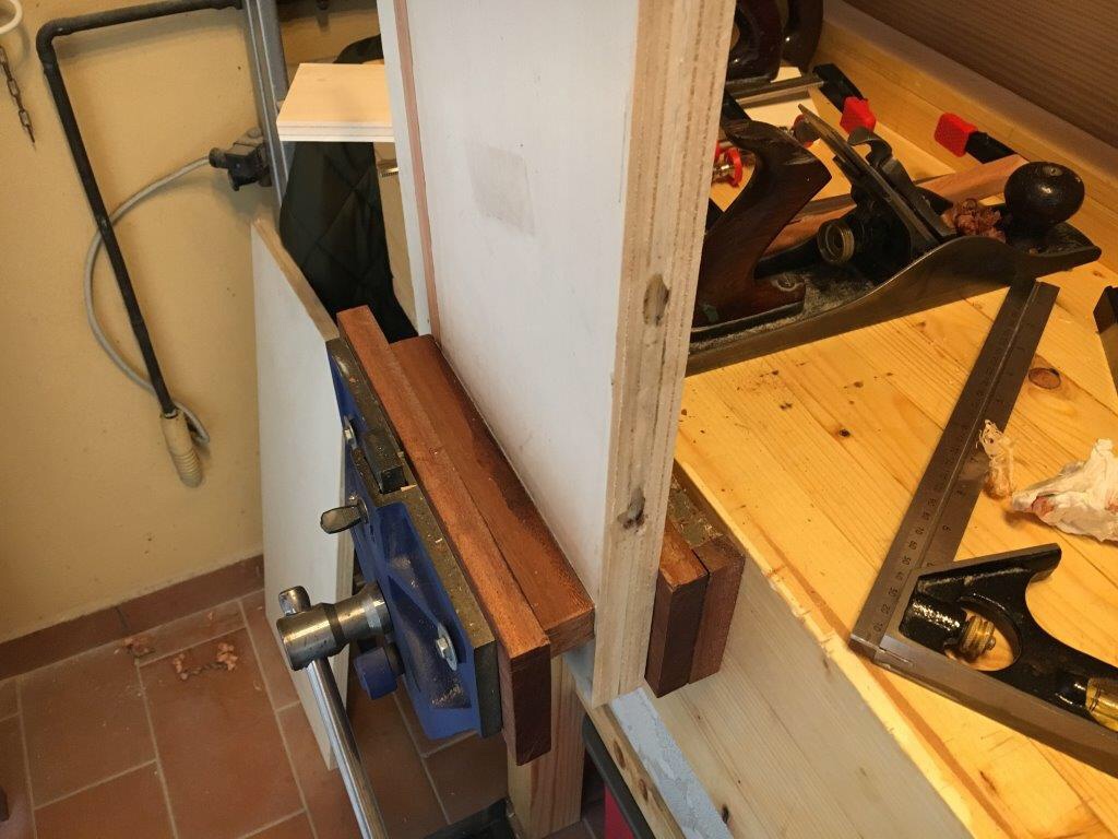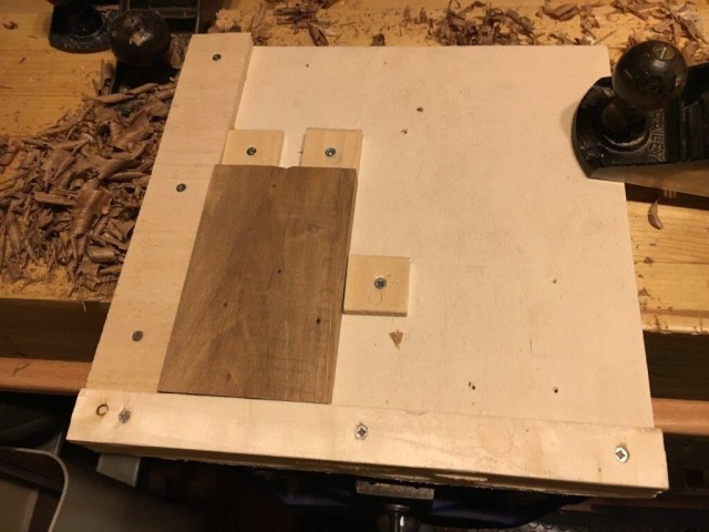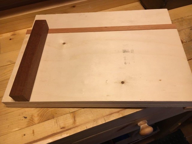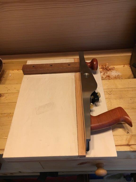 Perhaps we can name it in Italian as intestatrice or tavola per intestare. The main function of the shooting board is trimming a piece of wood and squaring the end grain so to make two consecutive sides of a piece of wood perfectly in square (at 90 degrees). It is also useful if we want to straighten a side of the wood, putting it in square with the face of the piece we are working on. It is very important therefore when we want to obtain absolutely squared pieces, in the perspective of the subsequent execution of joints such as dovetails or dado joints or mortise and tenon joint. It is particularly useful when we are squaring the edges of small pieces of wood, especially end grain, as this operation is quite difficult to be made in the bench vise. And it is in this last processing that its main use is found. It may optionally be equipped with one or more guides to finish cuts previously made at 45 degrees (used for example for the frames and side edges of the boxes).In its most widespread and simpler structure it is made up of two differently sized coupled boards on which an optional lateral guide and two bars, one up, the fence, where we put the piece we are working, and one down that serves to lock the board against the side of the bench or to be clamped in the vice. I show very briefly how I built my shooting board. Material and measures: lower base in plywood length 40 cm. width 30 cm. 1.5 cm thick; upper base in plywood length 40 cm. width 20 cm. 1.5 cm thick; lateral guide in hard wood length 40 cm. width 2 cm. 2 cm thick; top fence in hardwood length 22 cm. width 3 cm. 3 cm thick; lower wooden stop length 30 cm. width 2 cm. thickness 2 cm.The material for the boards can also be MDF but anyway it is better to avoid solid wood because it is more subject to deformation. The side guide may not be inserted but it is better to predict it and I will explain in a moment why. The fence and lower stop is better both in hard wood, because it is more resistant to shocks and splitting. First I glued and screwed the two bases together. The bases can be of different sizes from those used by me and that are quite conventional. The important thing is that they are of different width so as to leave space to accommodate the height of the plane placed in reclined position. In my case I left 8 cm. (because 2 cm are subtracted from the thickness of the lateral guide to). You can also choose only to glue up together the two boards or just screwing them together. The upper base (the one where the lateral guide is to be glued) must have the side absolutely at 90 degrees with the plane.Subsequently I proceeded to glue the hard wood guide along the upper base and plane it perfectly in square with the top and level with the upper base. The guide is important because in it I created the ledge or lip that allows the operation of the shooting board (we’ll see soon how it works in the specific).Below I glued and screwed a hardwood piece (which can also be of soft wood and of different sizes from those I used) that will serve as a stop and will allow the locking or tightening of the board. At the lower stop you can glue a strip of abrasive paper so as to avoid slippage as much as possible, especially if you plan to use it not inserted in the vice but resting in the counter side of the bench.As a last operation, I proceeded to insert the upper fence (and here I highly recommend the hardwood because it is more resistant to shocks and splitting). I placed the fence about 10 cm. from the edge of the base because doing so the action of the plane is well supported even after passing the fence itself. The length of the upper fence is dictated by the width of the upper base plus the width of the side guide, so it must be mounted in such a way that it ends perfectly flush with the side guide. The insertion of the upper fence is one of the critical points for the correct working of the shooting board. The fence must be assembled absolutely in square, therefore at 90 degrees, with respect to the base of the plane placed in reclined position and in contact with the lateral guide. It is a fundamental step because, if the fence was not positioned perfectly in square, the shooting board would be set badly at the start and our pieces would then be planed always out of square, effectively nullifying our work.You can decide to directly glue up the fence to the shooting board, or just screw it or glue it and screw it, eventually inserting it in a rabbet created in the base of the shooting board. It is particularly useful to insert, instead of screws and glue, pins into holes made slightly wider than the pins themselves. This allows you to make micro adjustments to the fence itself, if it move from the seat and lose the square position with the sole of the plane.In my case I preferred to simply glue and screw and fortunately the fence, after some time and after several uses, has not lost its position. Should I still make another in the future I would opt for the possibility of being able to adjust with micro movements. This would also obviate any error in the initial insertion of the fence itself. In any case, if the out-of-square problem should arise, you can glue a small piece of abrasive paper to compensate for the movement that has been created. Further, the fence must have the side that comes into contact with the piece to be worked in the square with the shooting board base.At the head of the fence on the farthest side I created a bevel that prevents any splitting of the fence itself during the use of the plane.Before starting to use the shooting board it is important to create a lip (or ledge) in the side guide. This is the other crucial element of the shooting board, the one that allows it to work. In fact, the question that everyone makes is: what prevents the plane to plane all the side guide before you get to the piece and then plane it endlessly? The answer is in the shape of the sole of the plane itself. If we look a