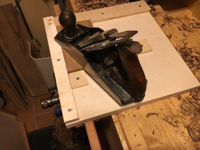 Quale pialla utilizzare? Non esiste una pialla dedicata da utilizzare. Diciamo che dovrebbe comunque possedere una certa massa ed una certa lunghezza. Quindi escludendo le shoulder plane a tutta lama nella base e le block plane, troppo piccole e leggere, diciamo che tutte le pialle dalla numero 4 fino alla 7 ed anche oltre vanno bene. Io utilizzo la Veritas low angle, bevel down, n. 5 jack plane e devo dire che mi ci trovo benissimo. E’ dotata di una buona massa e lunghezza ideale, la presentazione della lama in versione bevel down aiuta molto per la piallatura del legno di testa ed è provvista di una scanalatura nel fianco laterale che ne suggerisce e facilita l’utilizzo proprio sulle shooting board in posizione reclinata. Trovate sotto dei link dove poterla acquistare.