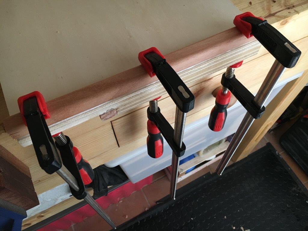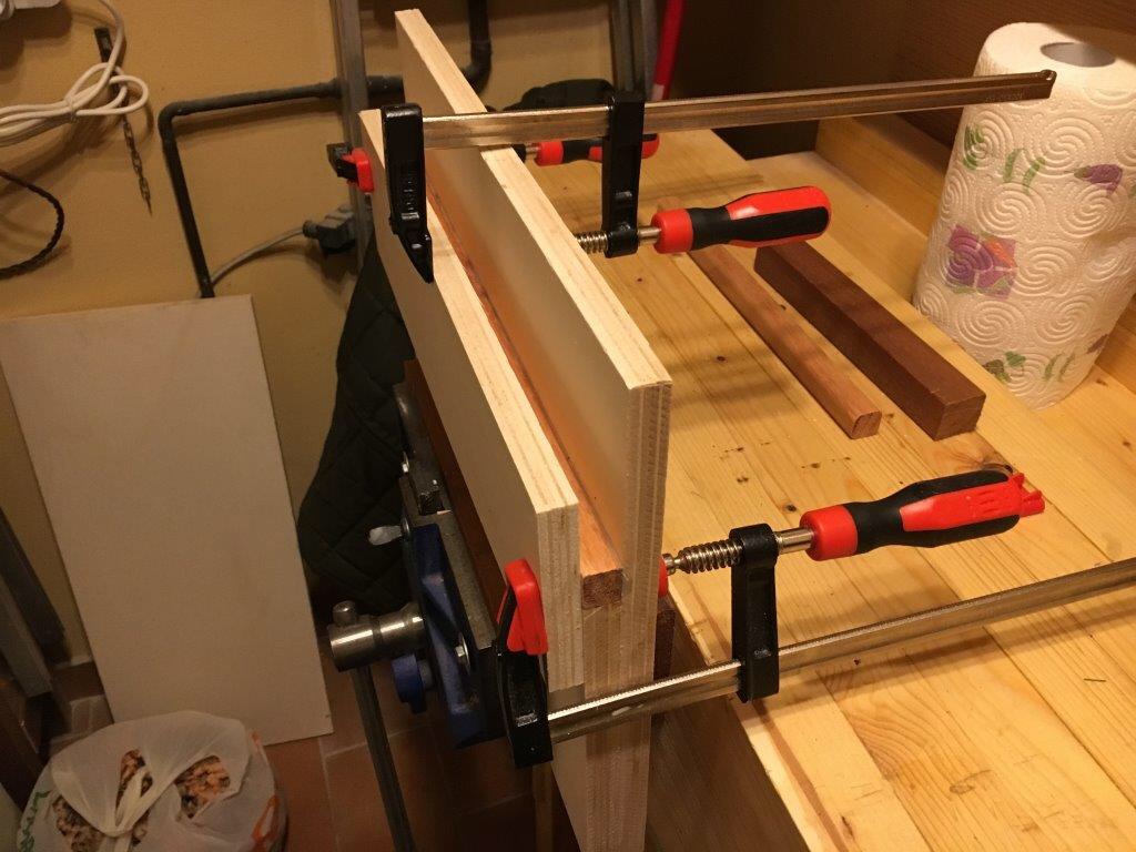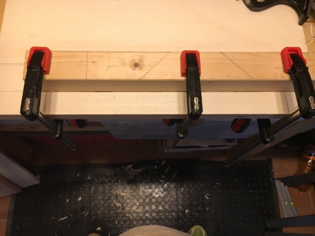 Come prima cosa ho incollato ed avvitato le due basi assieme. Le basi possono essere di misure diverse dal quelle da me utilizzate e che sono abbastanza convenzionali. L’importante è che siano di larghezza diversa così da lasciare lo spazio per ospitare l’ingombro in altezza della pialla posta in posizione reclinata. Nel mio caso ho lasciato 8 cm. (perchè 2 cm. sono sottratti dallo spessore del listello che fa da guida laterale all’azione della pialla). Si può optare anche nel solo incollare assieme le due tavole o nel solo avvitarle. Le base superiore (quella dove va incollata la guida laterale) deve avere il fianco assolutamente a 90 gradi con il piano.