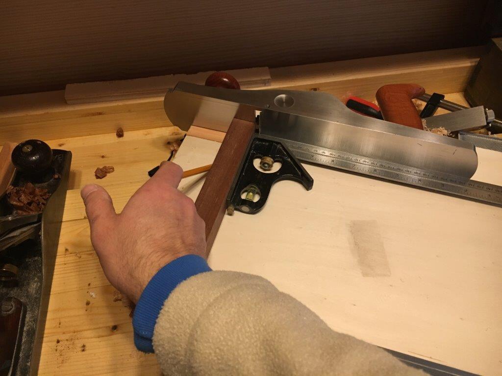 Come funziona infine la shooting board? Si serra la battuta inferiore nella morsa del banco o la si appoggia al fianco del banco stesso a riscontro. Quindi si appoggia il pezzo da piallare contro la battuta superiore facendolo sporgere minimamente e ponendolo a contrasto della base della pialla posta in posizione reclinata. La mano sinistra tiene il pezzo fermo contro la battuta e contemporaneamente spinge il pezzo verso la suola della pialla fino al contatto. La mano destra conduce la pialla in un movimento verso il pezzo ed avendo cura di mantenerla ben adesa alla base della shooting board e contro la guida laterale, in un movimento del tipo “affetta salumi”. La pratica poi ci aiuterà ad affinare la tecnica. Come detto, la shooting board è solitamente implementata con dei supporti che permettono di piallare pezzi precedentemente segati a 45 gradi. E’ possibile quindi inserire direttamente nella base un sostegno inclinato a 45 gradi oppure aiutarci con una squadra di grandi dimensioni in plastica appoggiata sulla battuta (cosa che sto facendo io).