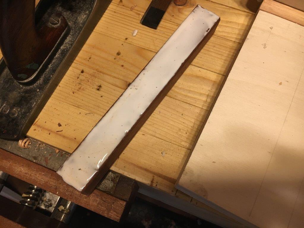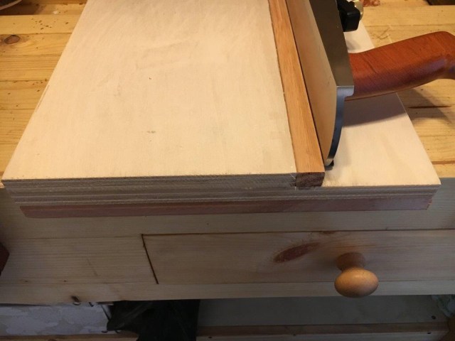 Successivamente ho provveduto ad incollare lungo la base superiore la guida in legno duro ed piallarla perfettamente in squadra con il piano ed a livello con la base superiore. La guida è importante in quanto nella stessa viene creato lo scalino (o battuta) che permette il funzionamento della shooting board (vedremo tra breve come lavora nello specifico).