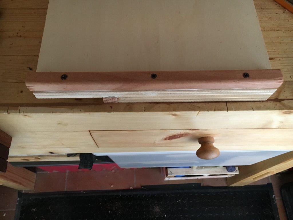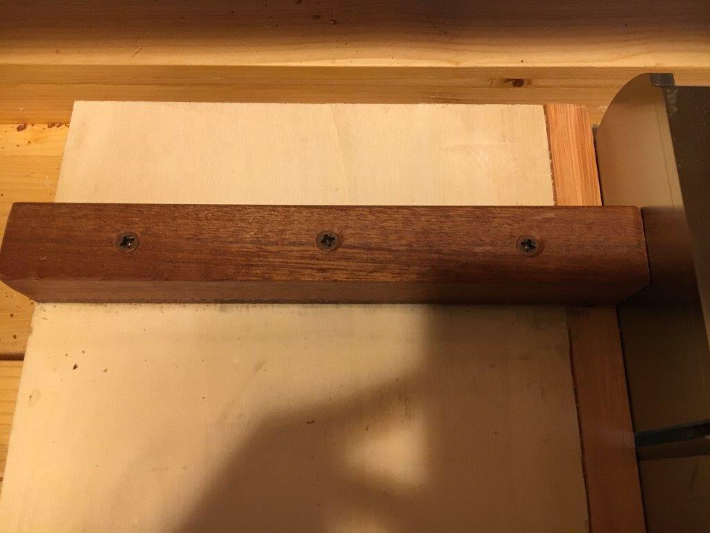 Di seguito ho incollato ed avvitato un listello di legno duro (che può essere anche di legno dolce e di misure diverse da quelle che ho utilizzato io) che farà da battuta inferiore e permetterà il bloccaggio o serraggio della tavola. Alla battuta inferiore si può incollare una striscia di carta abrasiva così da evitarne il più possibile lo slittamento, specialmente se si prevede di utilizzarla non inserita nella morsa ma appoggiata in riscontro al fianco del banco.