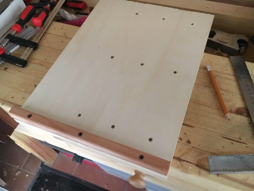 Materiale e misure: base in multistrato lunghezza 42 cm. larghezza 30 cm. spessore 2 cm.; battuta superiore in legno di pino, lunghezza 36 cm. larghezza 4 cm. spessore 4 cm.; battuta inferiore in legno duro lunghezza 42 cm. larghezza 2 cm. spessore 2 cm. La realizzazione è molto semplice.
