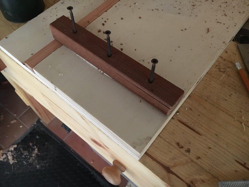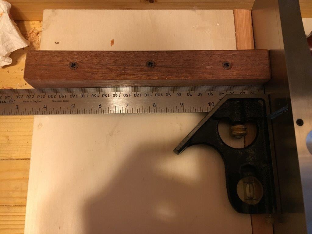 Nel mio caso ho preferito semplicemente incollare ed avvitare e fortunatamente la battuta, a distanza di tempo e dopo svariati utilizzi, non ha perso la sua posizione. Dovessi comunque costruirne un’altra in futuro opterei per la possibilità di poterla aggiustare con micro spostamenti. Questo ovvierebbe anche un eventuale errore in fase di inserimento iniziale della battuta stessa. In ogni caso se eventualmente dovesse presentarsi il problema del fuori squadro si può provvedere ad incollare un piccolo spessore in carta abrasiva che vada a compensare lo spostamento che si è creato. Infine la battuta deve avere il fianco che entra in contatto con il pezzo da lavorare in squadra con il piano della shooting board.