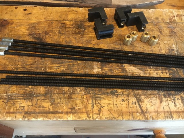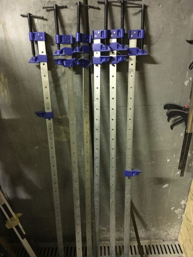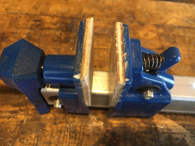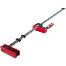 Sash clamps and pipe clamps, The sash clamps and pipe clamps are very similar. The difference lies in the shape of the bar, which is cylindrical in section in pipe clamps . However, the operating system is the same. They have a fixed jaw in which the screw clamp is inserted and a movable jaw that locks in predetermined positions using grooves in the bar itself (in those with a rectangular section bar) or holes in which cylindrical pins are inserted which act as block for the movable jaw (in those with linear profile). The sash clamps and pipe clamps are characterized by their particular length and the small size of the jaws. Given these characteristics, they are particularly suitable for jointing edge boards and for the construction of large tabletop. For this last use it is good practice to space them at regular intervals by positioning them on both sides of the top to be composed and possibly with the rod as close as possible to the pieces. In this way we will have a homogeneous distribution of the glue during the tightening and we will avoid the phenomenon of warping as much as possible. Personally, I found the rectangular section aluminum sash clamps particularly comfortable . They are cheap and very light but if used too intensely they still tend to deform unlike solid bar sash clamps which are more robust but also much heavier. To remedy the problem and following the instructions of Paul Sellers, which you can find at this link. https://paulsellers.com/2011/11/4473/ I proceeded to insert a reinforcement wood inside them and block it at the end with a punch. Furthermore, to avoid denting the pieces to be glued, I glued plywood plugs onto the metal jaws. With these simple precautions I can confidently say that these clamps are by far the best I own and the ones I usually use in my works. If they are too long for our needs, a good idea is to saw them at about 50/60 cm. of length. Below I indicate a link where you can buy them. https://www.amazon.it/gp/product/B000LFXIGC/ref=ppx_yo_dt_b_asin_title_o04_s00?ie=UTF8&psc=1