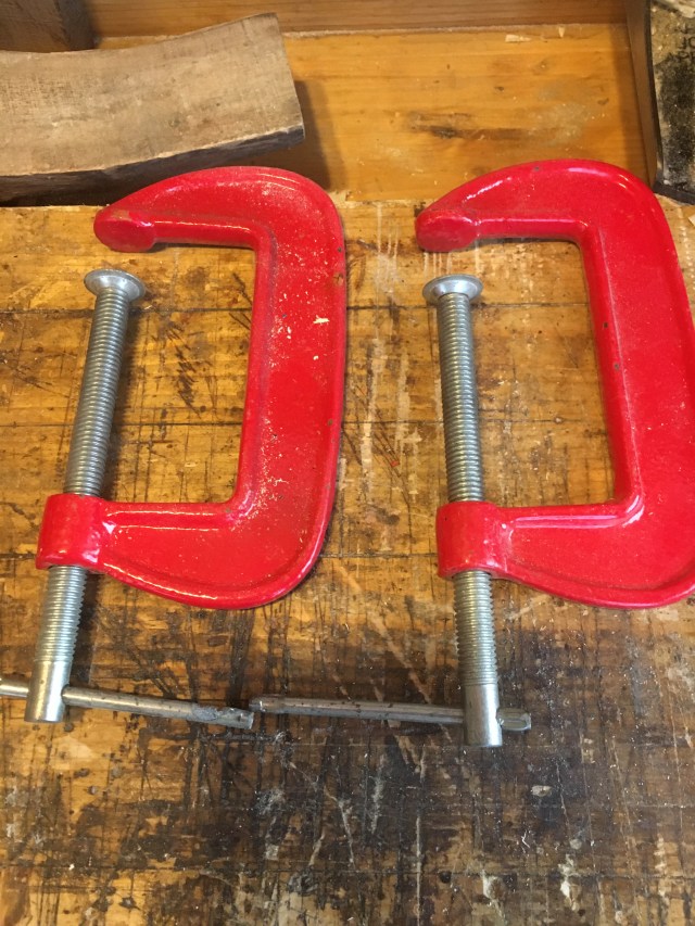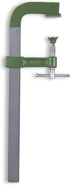 C-clamps. The name is due to their particular C-shape and they are made from a single piece of steel. On one end there is a small jaw while on the other a screw clamping system is mounted, which can reach a clamping capacity of several centimeters, and in which a backing pad is inserted that functions as a second jaw. The operation is intuitive and they are absolutely valid in terms of traction force. Although very solid, easy to handle, light and cheap, their intrinsic characteristics make it little used in traditional woodworking, relegating its use to some collateral activities.