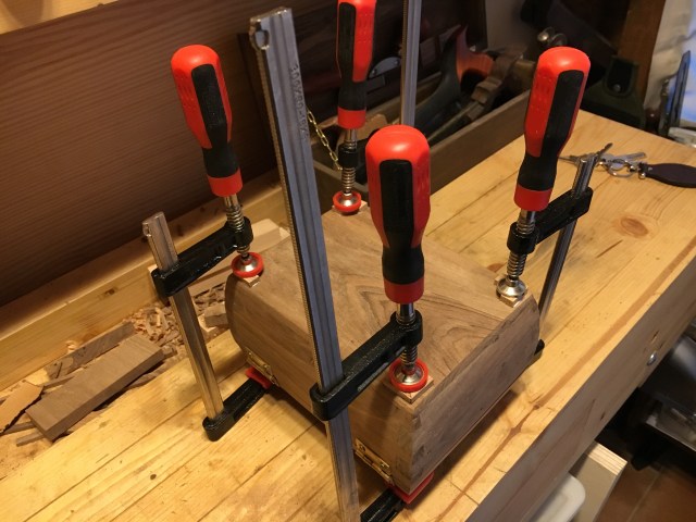 Il loro secondo compito, consequenziale al primo, è quello di serrare i due pezzi assieme in modo che si crei quell’ unione virtualmente indistruttibile. L’errore che spesso si compie in questa fase è quello di serrare troppo gli strettoi. Questo è assolutamente inutile, oltrechè dannoso, perché se la colla è stata applicata in modo omogeneo e con oculatezza su tutte le superfici che entrano in contatto sarà questa che in definitiva farà tutto il lavoro. Stringere con molta forza significherebbe peraltro far fuoriuscire la colla dalle unioni con il risultato di ottenere un assemblaggio debole. Inoltre, specialmente se dobbiamo incollare una serie di tavole di costa (come ad esempio nella costruzione di un piano di un tavolo), il rischio è che il piano, una volta asciugata la colla, risulti imbarcato, costringendoci ad un faticoso lavoro di piallatura al fine di recuperarne la planarità, oltre al fatto che, così facendo, otterremmo una tavola con uno spessore ridotto. Ricordiamoci infine che le colature di colla sono particolarmente insidiose per la successiva fase di finitura. Per queste ed altre problematiche inerenti le colle vi rimando al link di seguito. Le colle per legno / Wood glues
