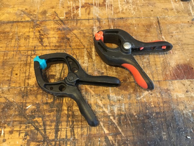 Spring clamps. Usually of small size and made of plastic, they are easily recognizable by their clamp shape. Their operation is intuitive and comparable to that of common clothes pegs, thanks to a particularly performing central internal spring that allows safe positioning. They are equipped with small tilting jaws, usually in plastic or hard rubber, and their use is attributable to all those operations in which we have to glue small pieces. Therefore, they are very useful in small woodworking, decoupage and model making due to their small size that require use with one hand, finding the only limitation in the opening capacity and clamping depth. Furthermore, their traction force is modest and their use is therefore more in the positioning of the pieces than in the actual clamping. They can be found on the market in various sizes and can be purchased for a few euros in the various brico .