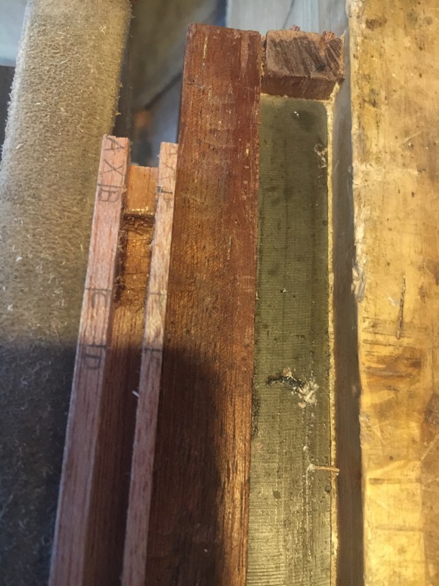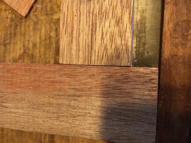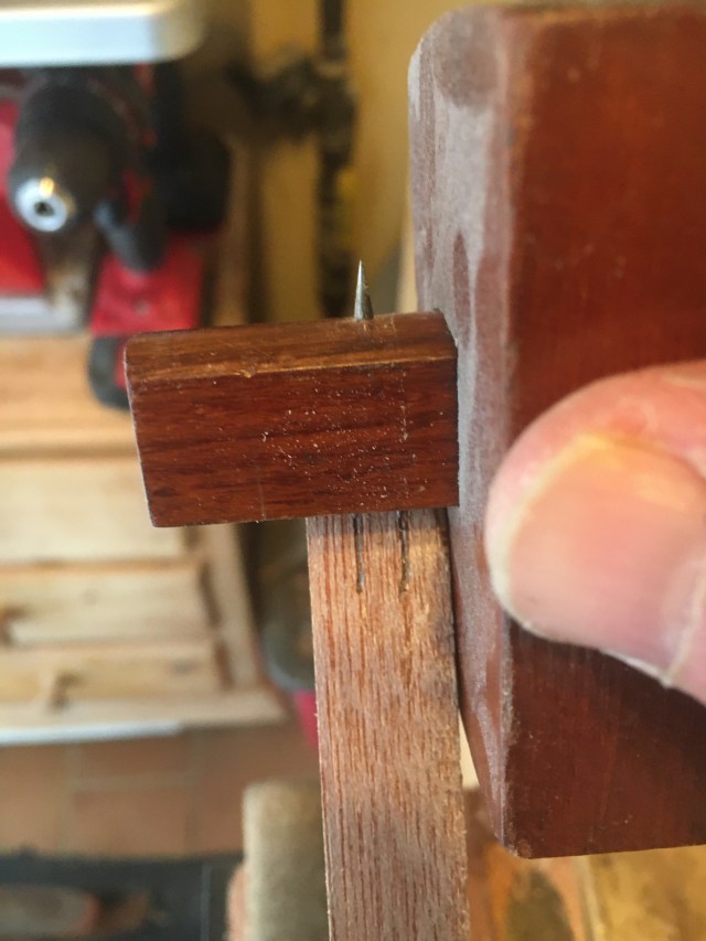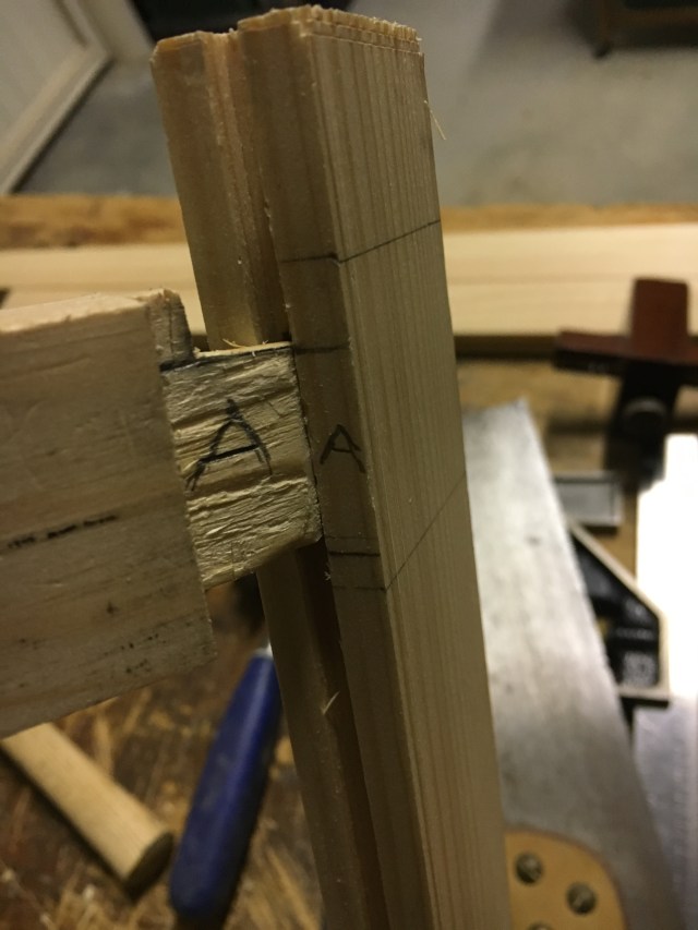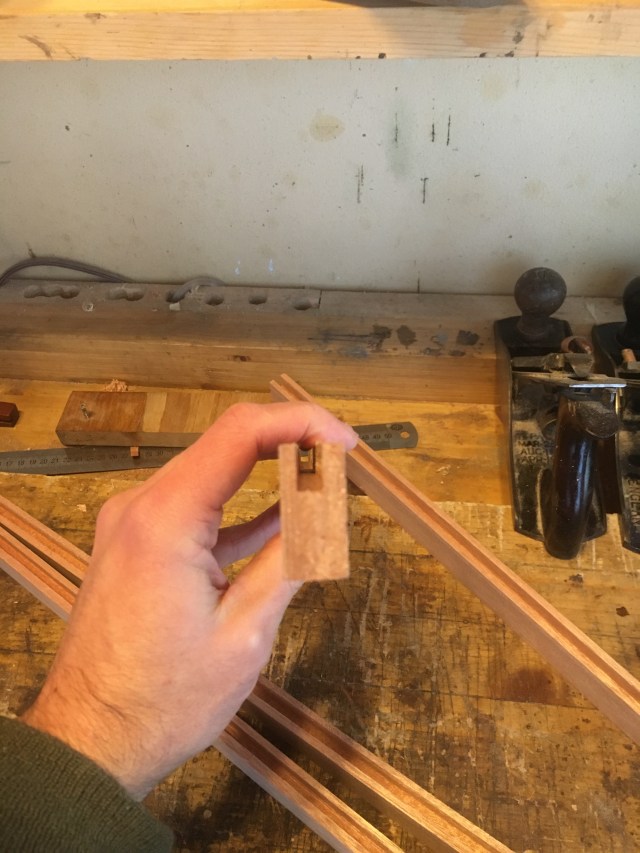 Il segmento AB è la parte che andrà rimossa alla fine, una volta ultimato il telaio. Il segmento BC (evidenziato all’interno del canale) è la mortasa. Il segmento CD è lo spazio del canale del traverso. Il segmento BD rappresenta la larghezza del traverso. Di seguito una foto di come risulta l’incastro alla fine, una volta fatto il tenone.