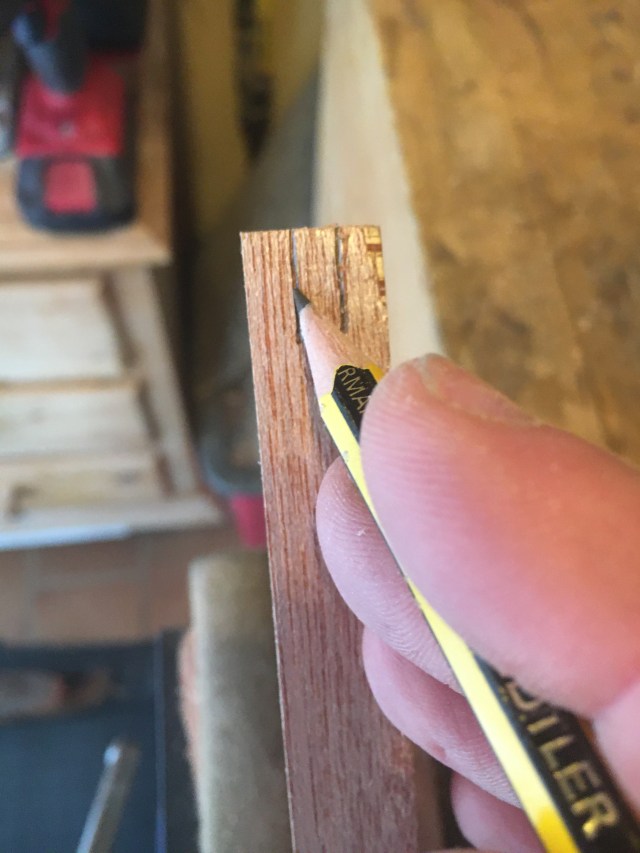 Quindi con il truschino, impostato con le due punte sulla larghezza della mortasa (o del canale, che è la stessa cosa), si riporta lo spessore del tenone sullo spessore del traverso e lo si definisce con una matita appuntita. Si pratica il knifewall approfondendo così la traccia fatta in precedenza sulle facce del traverso e si sega fino alle tracce del truschino, facendo attenzione a segare dritto e a non oltrepassarle.