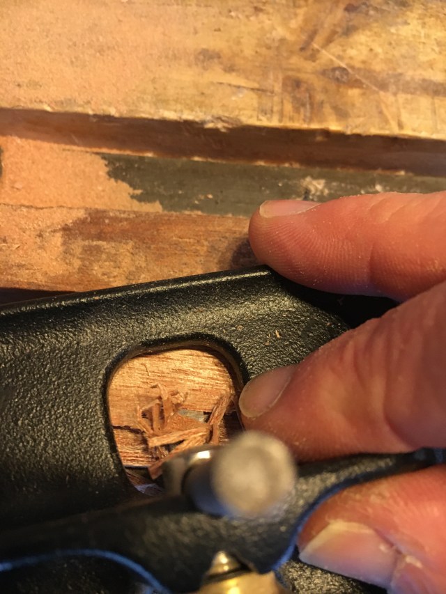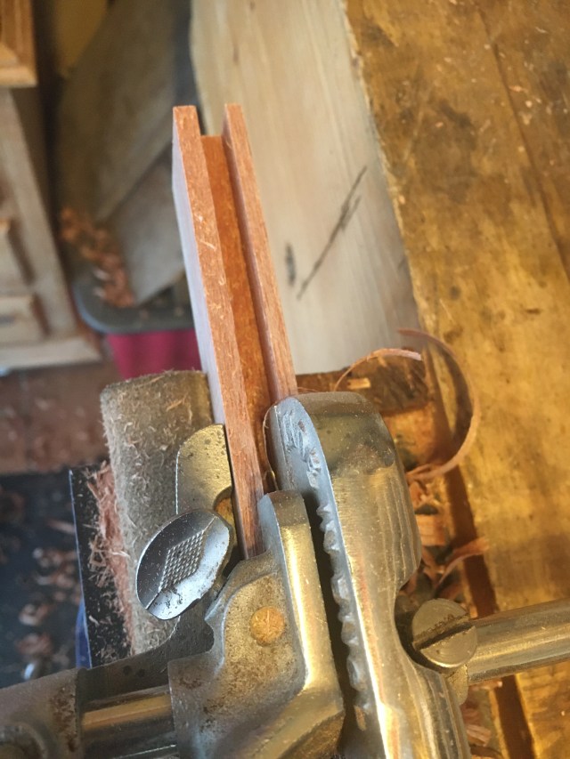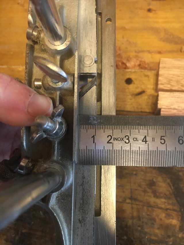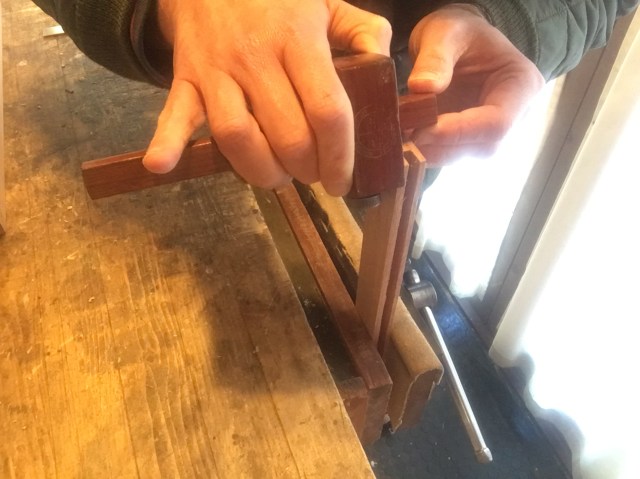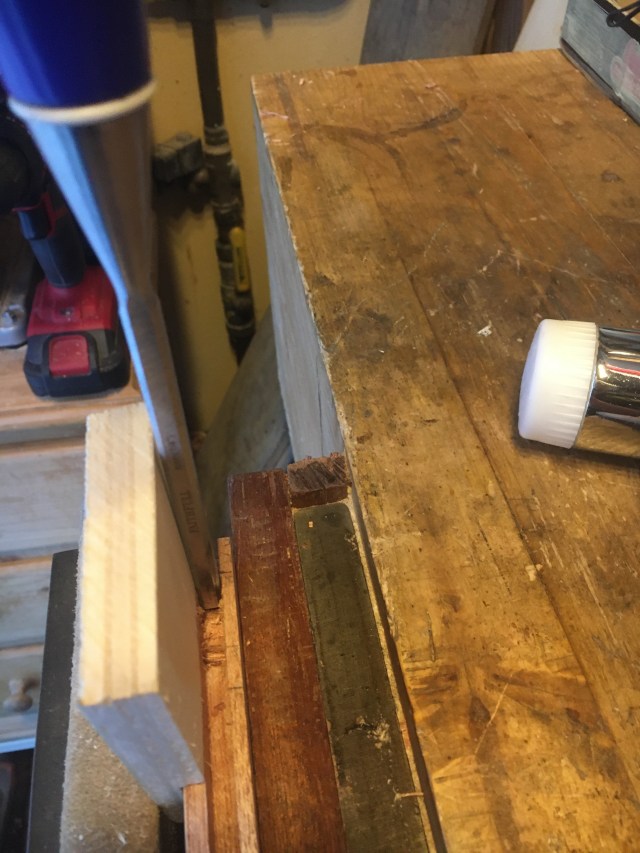 Per scavare le mortase ho utilizzato un jig autocostruito che mi ha aiutato a mantenere lo scalpello in posizione perpendicolare e ben adesso alla parete della mortasa. Questo farà sì che lo scavo della mortasa venga dritto, condizione importante a che il tenone entri nella mortasa senza storture. In effetti, l’eventuale stortura del tenone si ripercuoterebbe sull’intero telaio risultando svergolato.