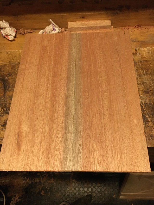 Nel mio caso, non disponendo di un pannello di dimensioni adeguate, ho provveduto a segare e poi giuntare due pannelli, piallando poi il pannello così ottenuto fino alle misure necessarie. Le misure del pannello devono essere uguali alla distanza tra i montanti (e dei traversi) aggiungendo la profondità della scanalatura (ricordiamoci che le scanalature sono su ambedue i pezzi, quindi questa misura va inserita due volte). Nel mio caso la scanalatura del telaio è di 0,6 cm. di larghezza per 1,1 cm. di profondità. Essendo il pannello di spessore 1,5 cm. ho dovuto portare tale spessore fino a 0,6 cm. ottenendo di fatto un pannello bugnato.