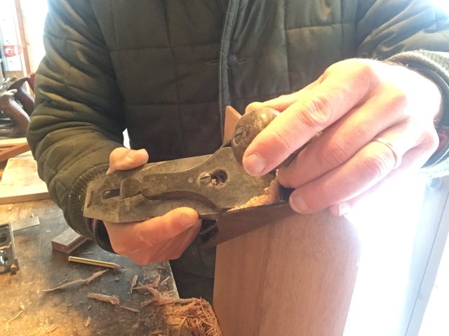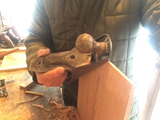 Per ottenere la rastrematura lungo tutto il perimetro del pannello e su ambedue le facce ho dapprima tracciato a matita la misura della bugna e poi con il truschino tracciato la profondità sullo spessore del pannello. Quindi, con la pialla e con molta pazienza, ho lavorato dapprima i lati corti traverso vena, con la pialla inclinata a circa 45 gradi, variando progressivamente sia l’inclinazione della pialla che la protrusione della lama e cercando di non oltrepassare la linea a matita e la traccia del truschino. L’inclinazione della pialla eviterà la scheggiatura del legno in uscita. Per i lati lungovena è invece possibile usare la pialla senza inclinazione in quanto non avremo il problema della scheggiatura. Lavoriamo facendo sempre prima il traverso vena e dopo il lungo vena in quanto eventuali imperfezioni del traverso vena verranno corrette con i passaggi lungovena. Facciamo passate decise e veloci specialmente traverso vena dapprima rimuovendo molto materiale direttamente dall’angolatura del bordo e poi, dando meno lama, lavoriamo vicino ai bordi tracciati. Infine rifiniamo con poca lama tutta la bugnatura così ottenuta.