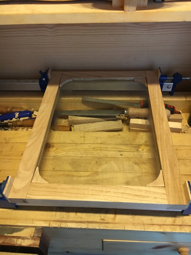 Nel mio caso, il pannello non è venuto come desideravo, in quanto l’idea era di ottenere una bugna dai contorni ben definiti ed ho invece ottenuto una bugna poco delineata, seppur effettivamente rastremata. Cerchiamo sempre di non assottigliare troppo vicino ai bordi del pannello altrimenti, una volta inserito all’interno del telaio, si noteranno delle antiestetiche fughe tra il telaio ed il pannello stesso. Piallato e passato tutto il pannello con la carta abrasiva ho provato l’inserimento del pannello e la chiusura del telaio. Sono stati necessari svariati tentativi e correzioni affinché il pannello entrasse nel telaio senza impedimenti e senza sforzare. Fatta la prova finale a secco e soddisfatto del risultato ottenuto ho disassemblato il tutto e sono passato alla fase di incollaggio. La colla va distribuita all’interno delle mortase e sui tenoni (senza eccedere) ma non all’interno della scanalatura, in quanto il pannello deve rimanere libero di assecondare i movimenti stagionali ai quali il legno è sempre sottoposto. Inseriamo un paio di strettoi solo in corrispondenza degli incastri e senza stringere troppo. Se abbiamo lavorato bene, ad incollaggio ultimato e rimossi gli strettoi, il pannello dovrebbe essere ben solido all’interno del telaio, senza alcun tipo di movimento e vibrazione. Nessuno spazio dovrebbe essere visibile nelle linee di giunzione degli incastri e lungo tutto il perimetro tra il telaio e il pannello.