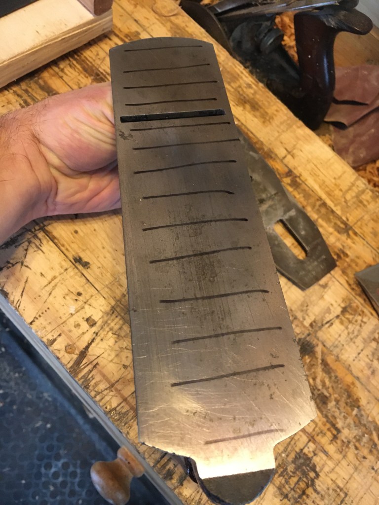 Leaving the blade mounted but retracting it above the mouth we practice with a black marker some parallel traces on the sole of the plane and rub it on the abrasive paper starting from an 80 grit (we could also start from a higher grit, it depends on the condition of the sole ) and we work until the traces have disappeared or in any case not very visible.