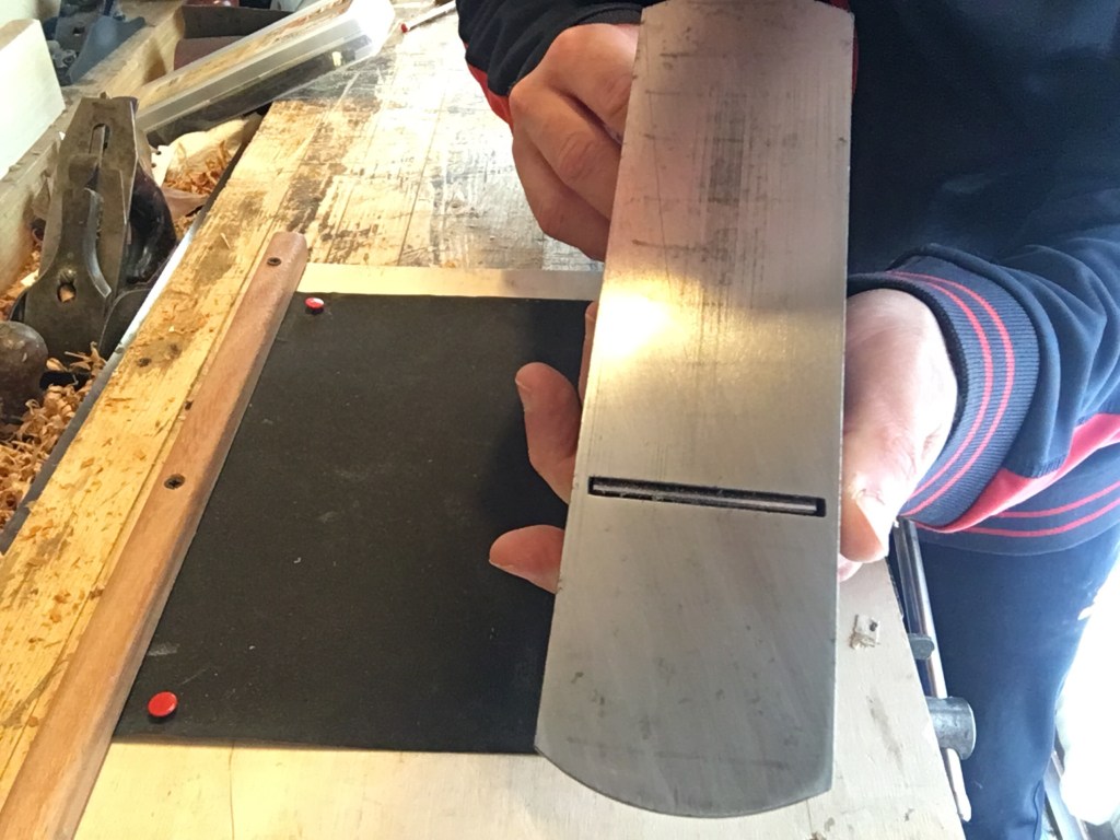 We move the iron back so that it does not come out of the mouth, we grab the plane upside down, then with the sole facing upwards, holding it with the front knob in the left hand while with the right hand we rotate the knurled wheel that controls the movement of the iron moving to the right until we see the cutting edge coming out of the mouth of the sole. For this operation it is advisable to put yourself in favor of light and look at the sole with only one eye so as to be able to improve focus.