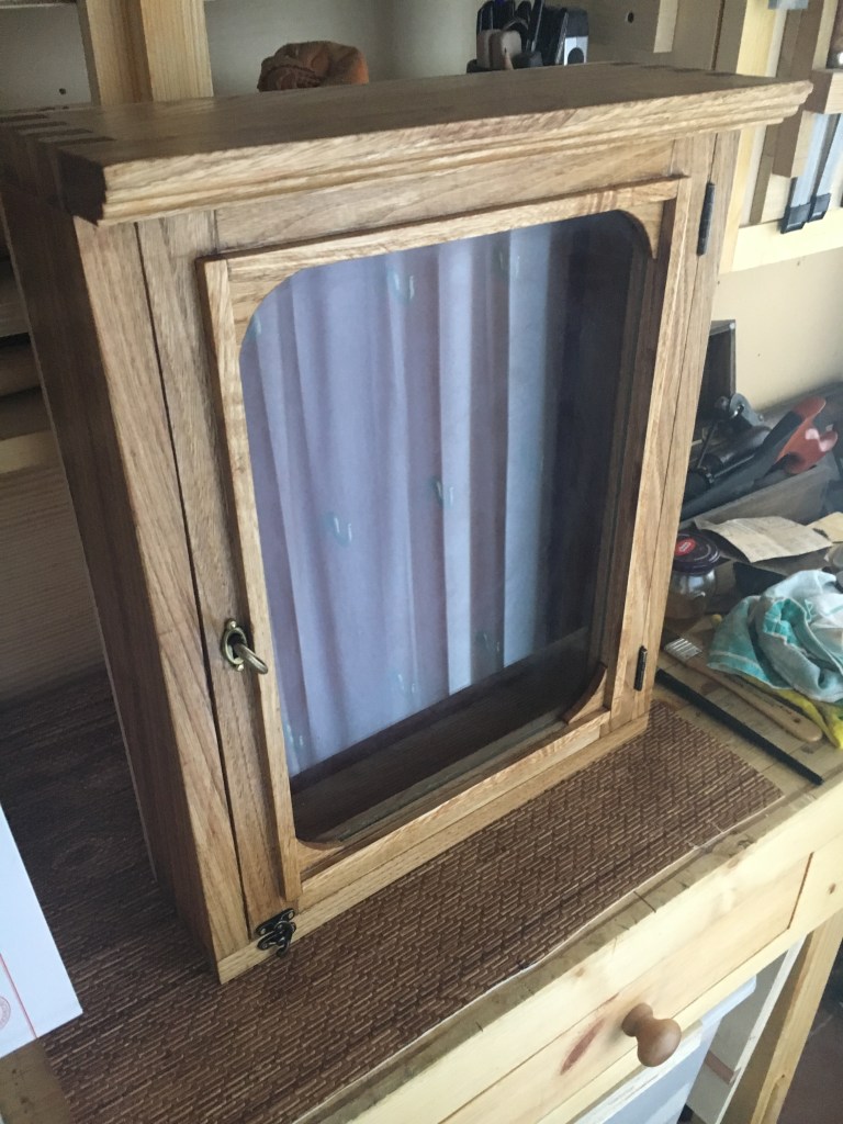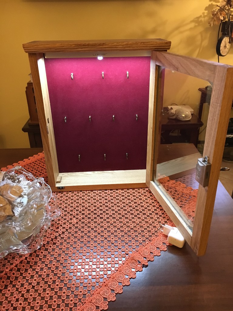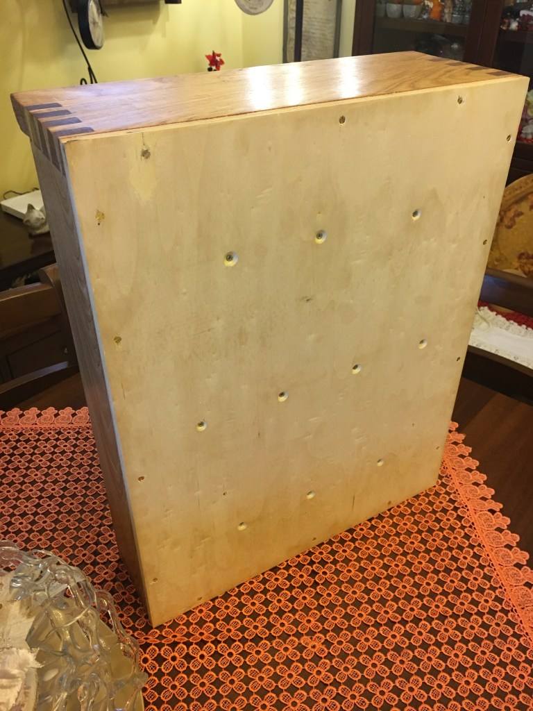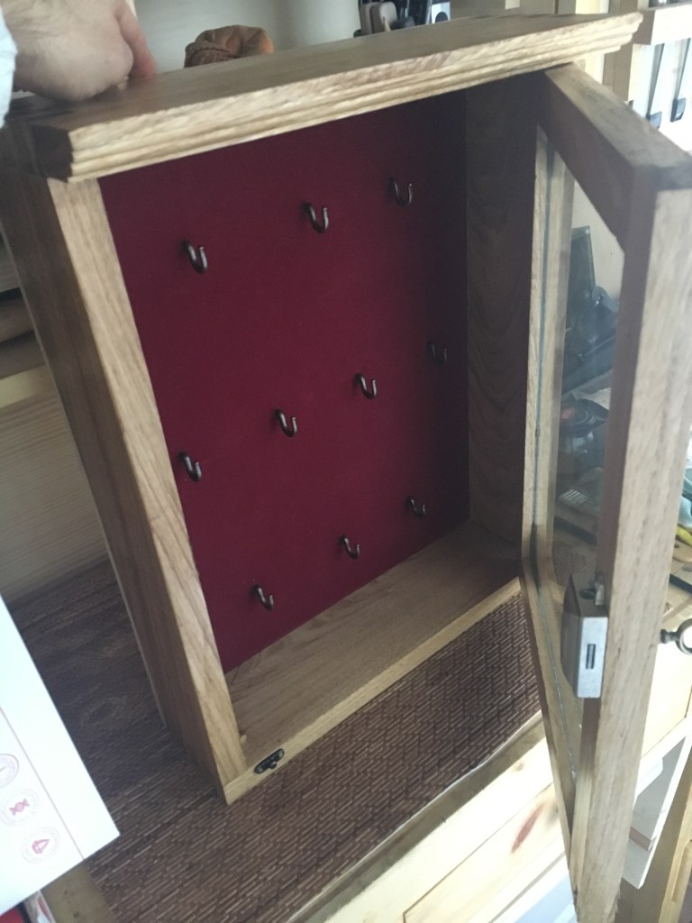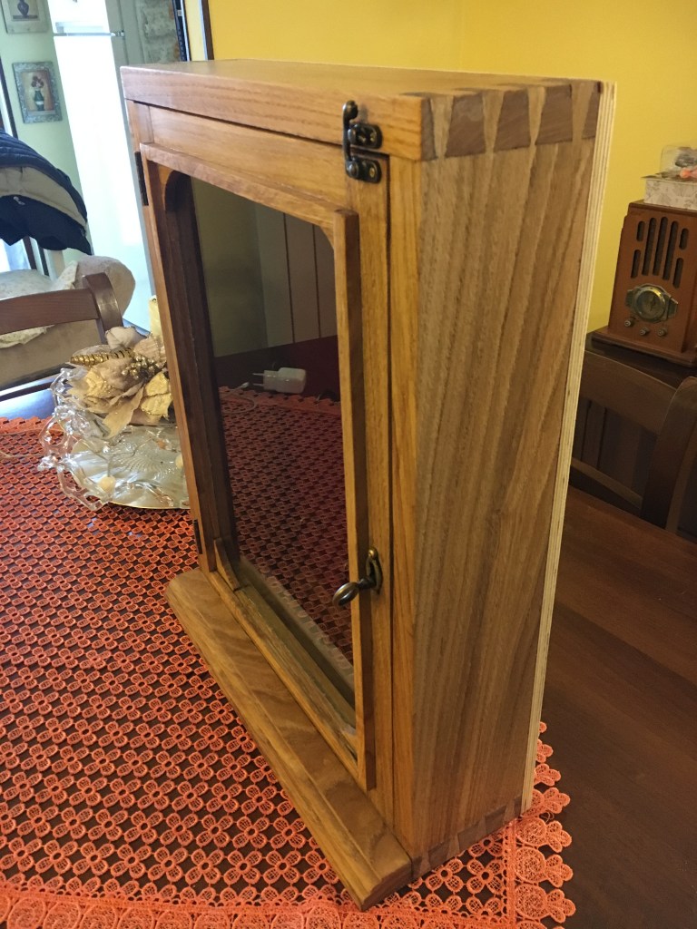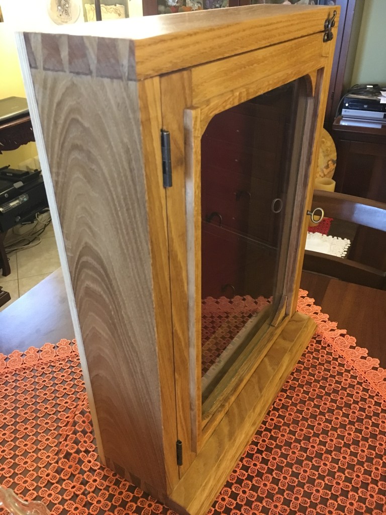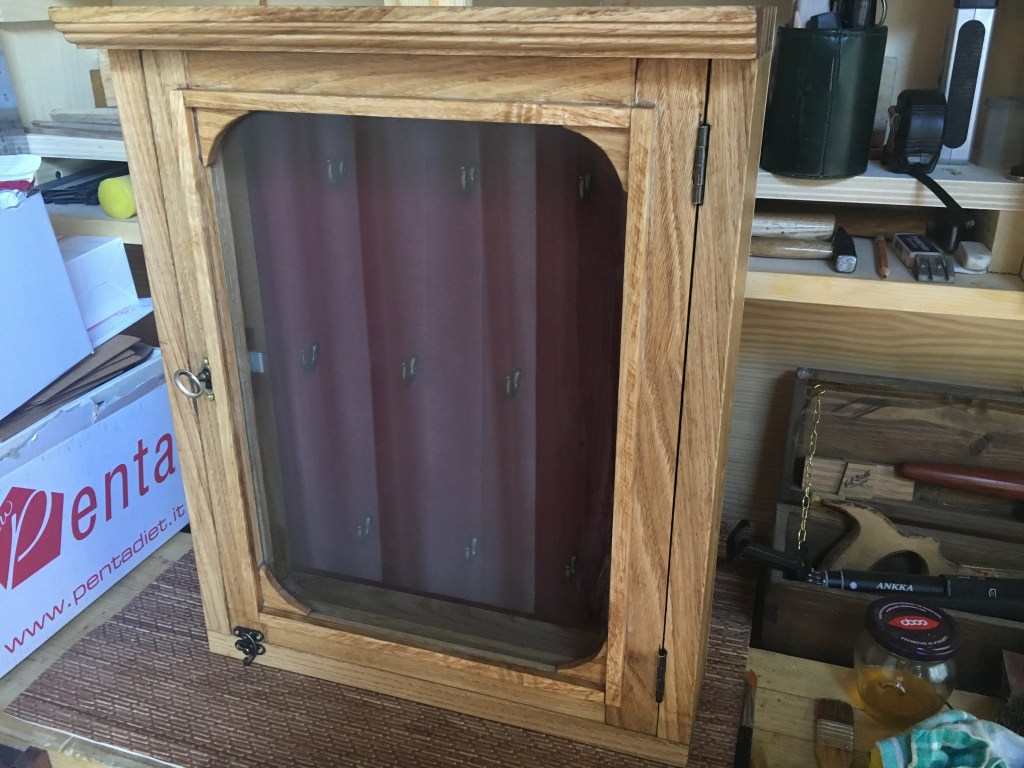 È un manufatto di qualche tempo fa. Si tratta di una piccola vetrina bacheca dotata di gancetti per appendere orologi ma potrebbe prestarsi anche come vetrina portachiavi. Può essere sia appesa al muro che appoggiata su un mobile in posizione capovolta ovviamente ruotando i gancetti. Realizzata in legno di castagno di spessore di circa 2 cm. e pannello posteriore in multistrato di pioppo di 1 cm. di spessore. La finitura è a olio e cera. Le misure esterne sono 50 cm. di altezza, 40 cm. di larghezza e 11 cm. di profondità. La vetrina è dotata di un sistema di illuminazione in modalità permanente / spenta / automatica ad apertura dell’anta. Gli incastri della carcassa sono a coda di rondine mentre quelli del telaio dello sportello a tenone e mortasa. Il vetro è di 4 mm. di spessore ed è inserito in un canale praticato nel telaio. Foderato con panno in velluto color bordeaux e munito di serratura con chiave e chiusura a gancetto. E’ stato un lavoro molto interessante in quanto mi ha dato modo di utilizzare molte delle tecniche viste fino ad adesso, Di seguito inserisco alcune foto della lavorazione, numerate in ordine sequenziale.