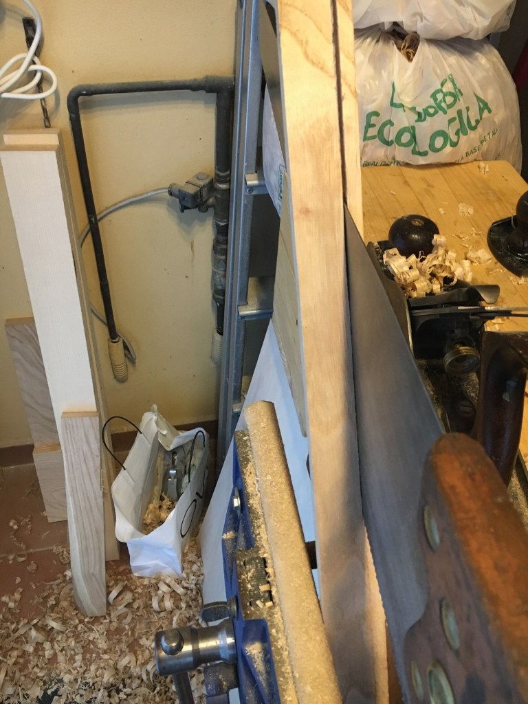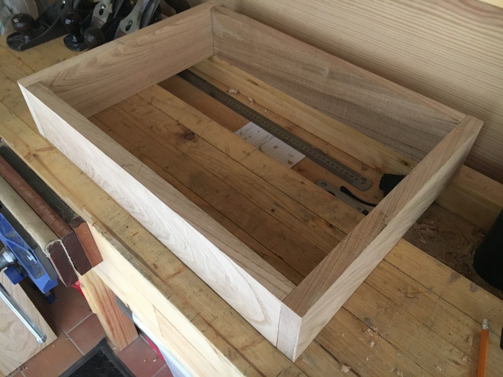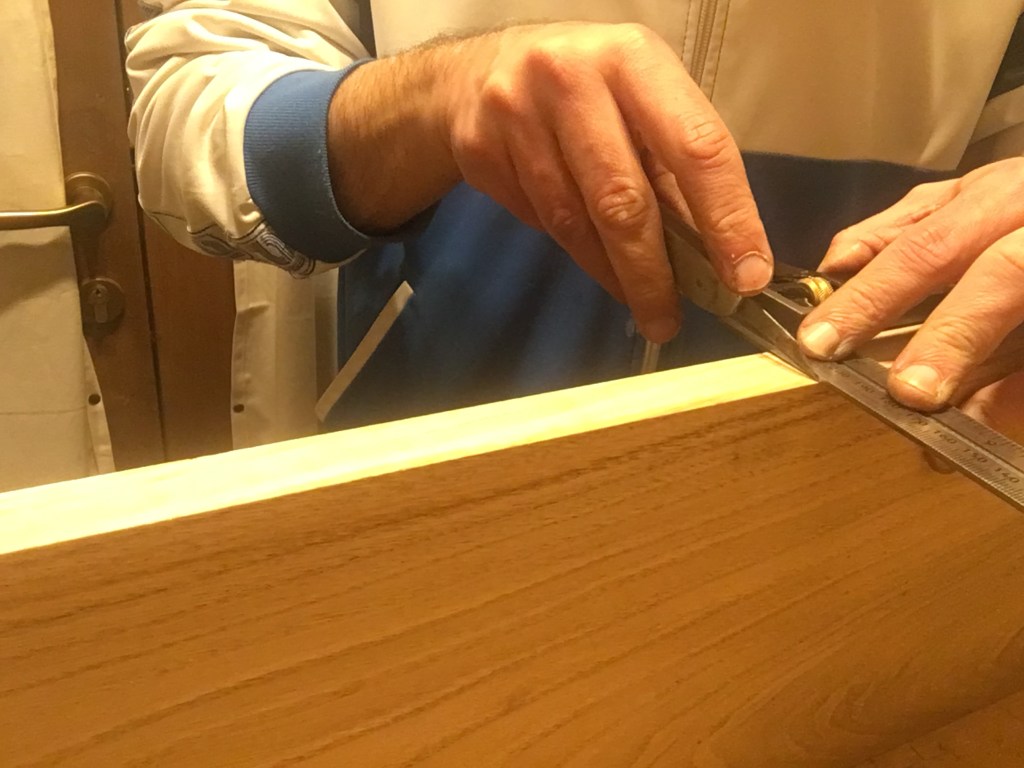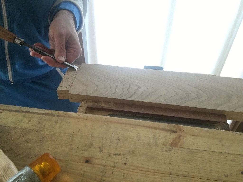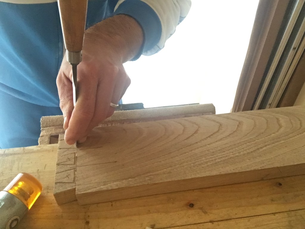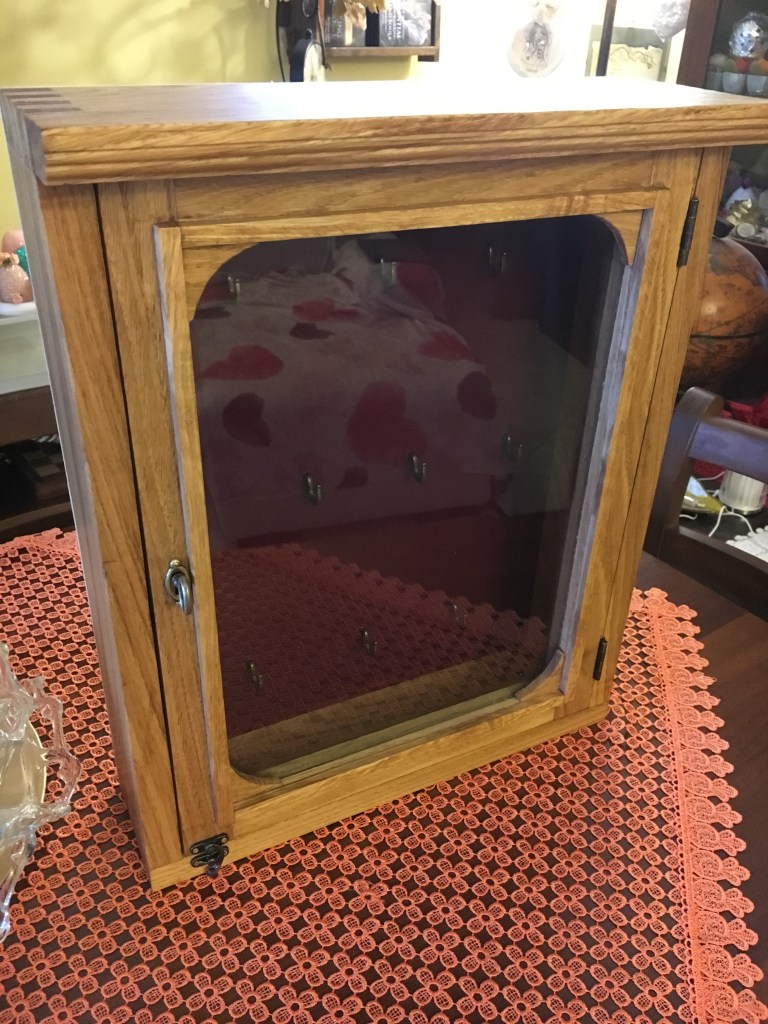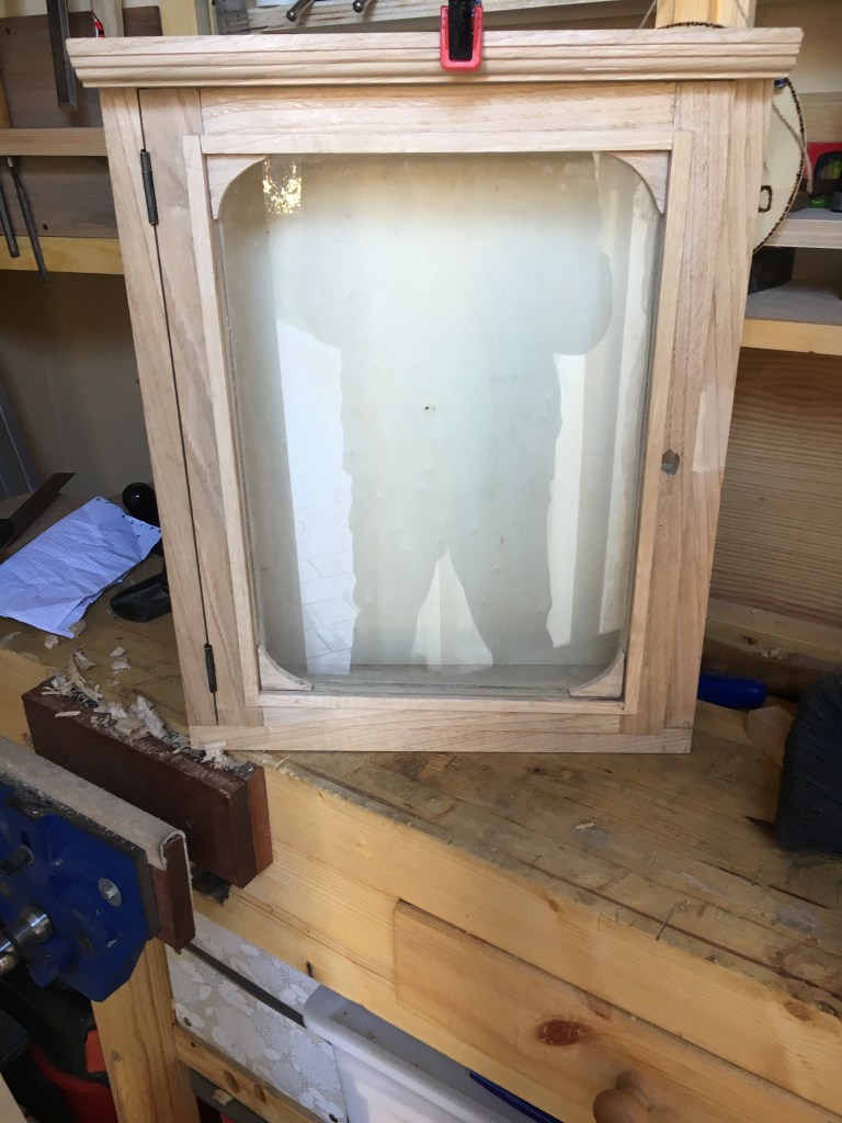È un manufatto di qualche tempo fa. Si tratta di una piccola vetrina bacheca dotata di gancetti per appendere orologi ma potrebbe prestarsi anche come vetrina portachiavi. Può essere sia appesa al muro che appoggiata su un mobile in posizione capovolta ovviamente ruotando i gancetti. Realizzata in legno di castagno di spessore di circa 2 cm. e pannello posteriore in multistrato di pioppo di 1 cm. di spessore. La finitura è a olio e cera. Le misure esterne sono 50 cm. di altezza, 40 cm. di larghezza e 11 cm. di profondità. La vetrina è dotata di un sistema di illuminazione in modalità permanente / spenta / automatica ad apertura dell’anta. Gli incastri della carcassa sono a coda di rondine mentre quelli del telaio dello sportello a tenone e mortasa. Il vetro è di 4 mm. di spessore ed è inserito in un canale praticato nel telaio. Foderato con panno in velluto color bordeaux e munito di serratura con chiave e chiusura a gancetto. E’ stato un lavoro molto interessante in quanto mi ha dato modo di utilizzare molte delle tecniche viste fino ad adesso, Di seguito inserisco alcune foto della lavorazione, numerate in ordine sequenziale.