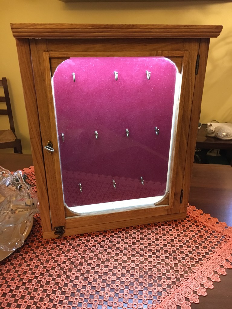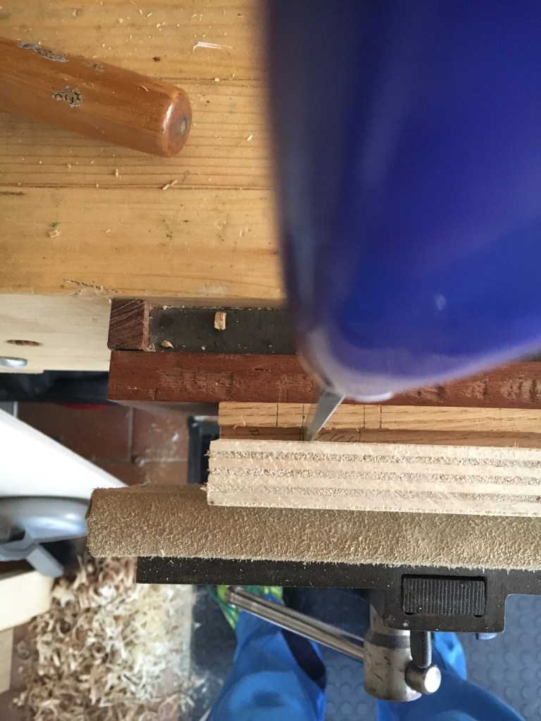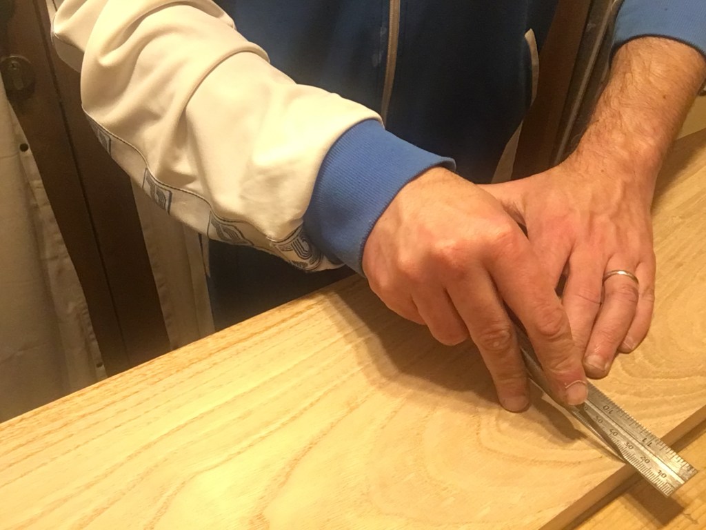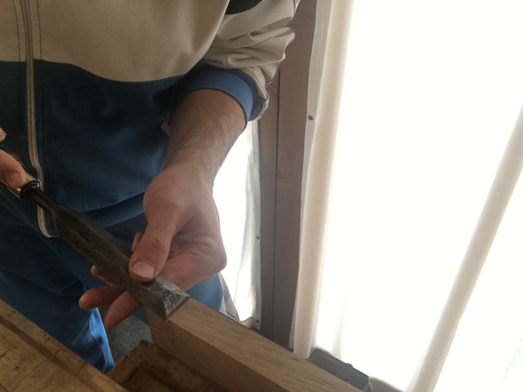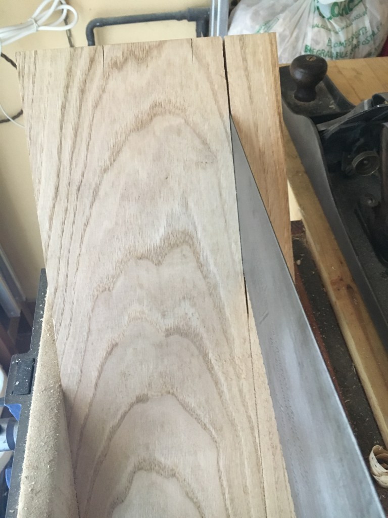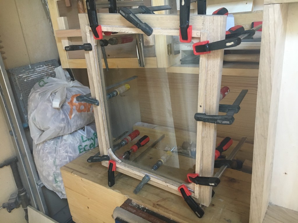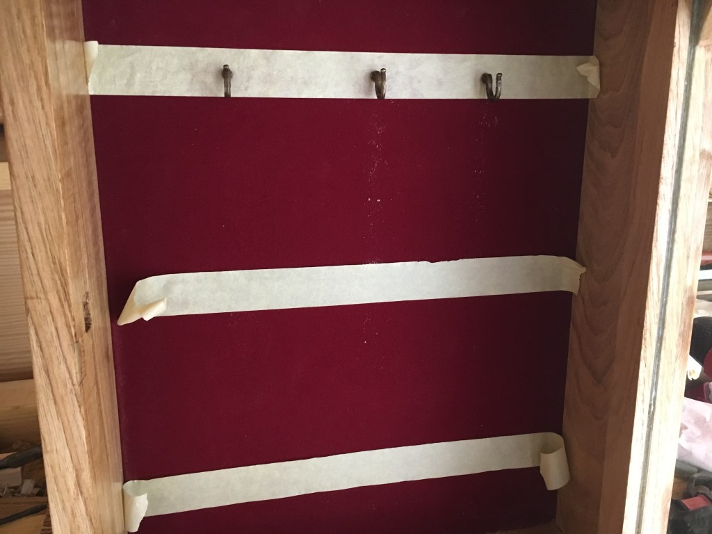 È un manufatto di qualche tempo fa. Si tratta di una piccola vetrina bacheca dotata di gancetti per appendere orologi ma potrebbe prestarsi anche come vetrina portachiavi. Può essere sia appesa al muro che appoggiata su un mobile in posizione capovolta ovviamente ruotando i gancetti. Realizzata in legno di castagno di spessore di circa 2 cm. e pannello posteriore in multistrato di pioppo di 1 cm. di spessore. La finitura è a olio e cera. Le misure esterne sono 50 cm. di altezza, 40 cm. di larghezza e 11 cm. di profondità. La vetrina è dotata di un sistema di illuminazione in modalità permanente / spenta / automatica ad apertura dell’anta. Gli incastri della carcassa sono a coda di rondine mentre quelli del telaio dello sportello a tenone e mortasa. Il vetro è di 4 mm. di spessore ed è inserito in un canale praticato nel telaio. Foderato con panno in velluto color bordeaux e munito di serratura con chiave e chiusura a gancetto. E’ stato un lavoro molto interessante in quanto mi ha dato modo di utilizzare molte delle tecniche viste fino ad adesso, Di seguito inserisco alcune foto della lavorazione, numerate in ordine sequenziale.