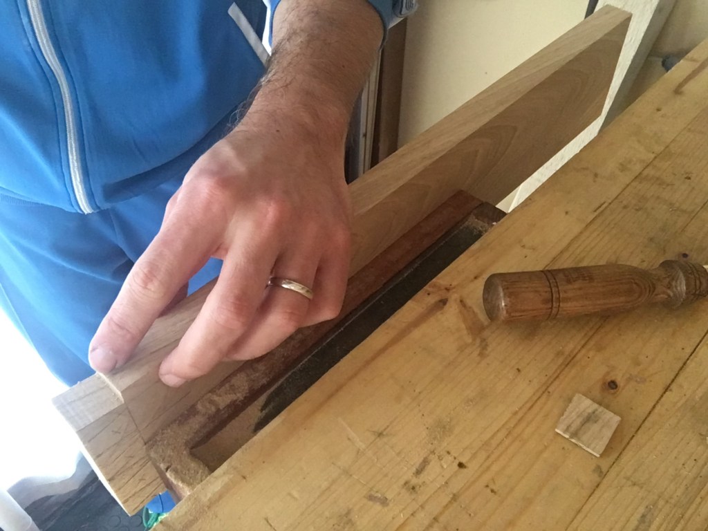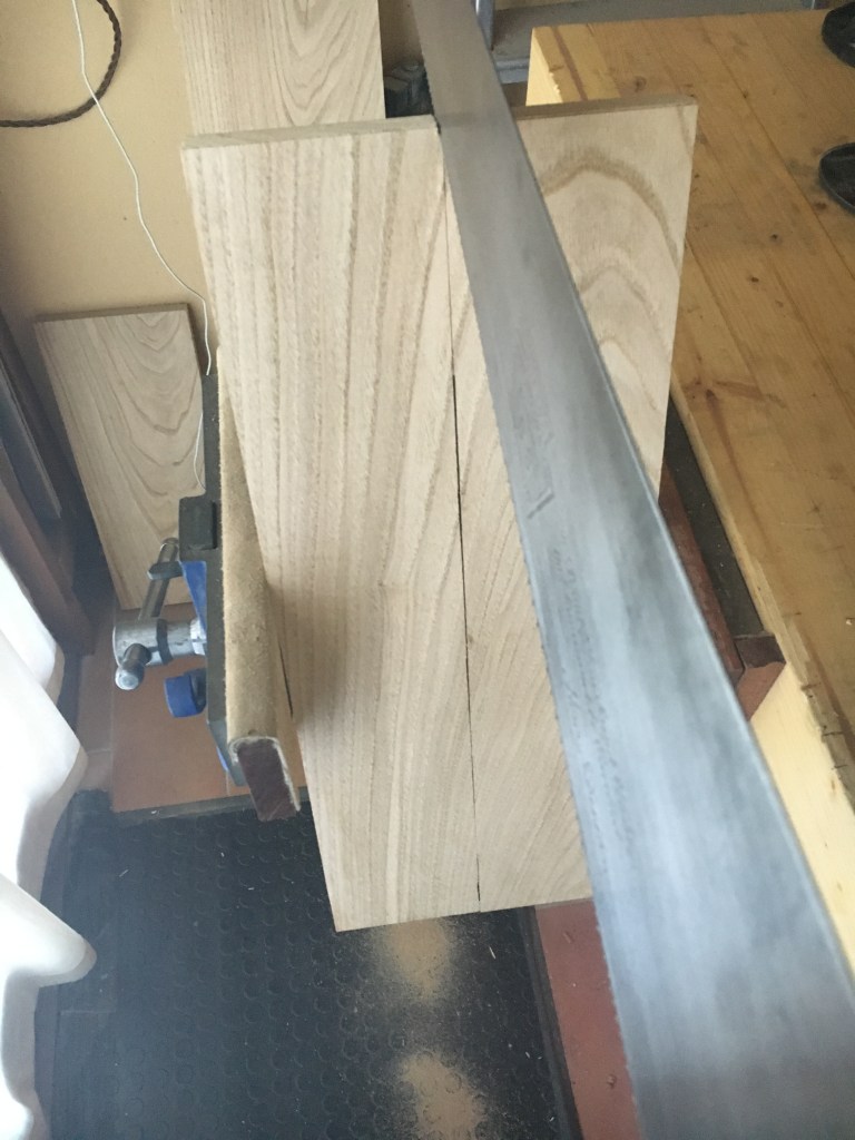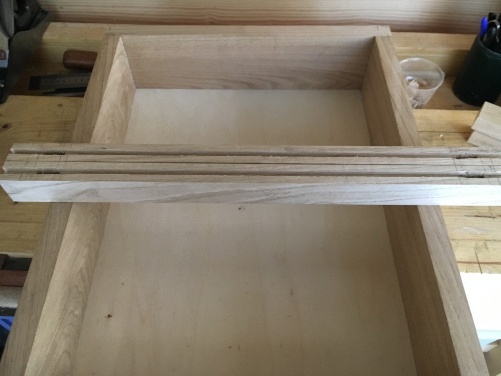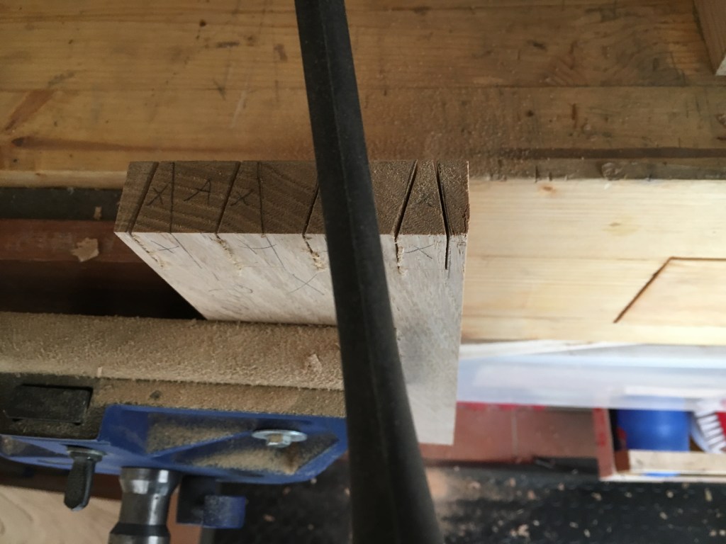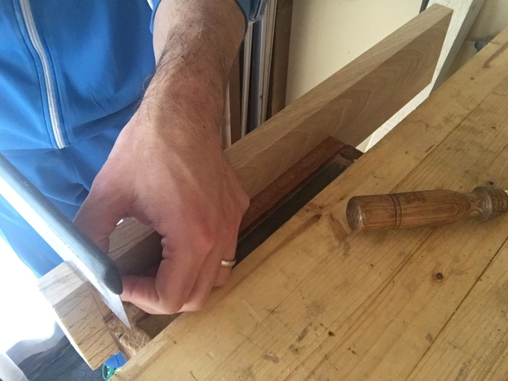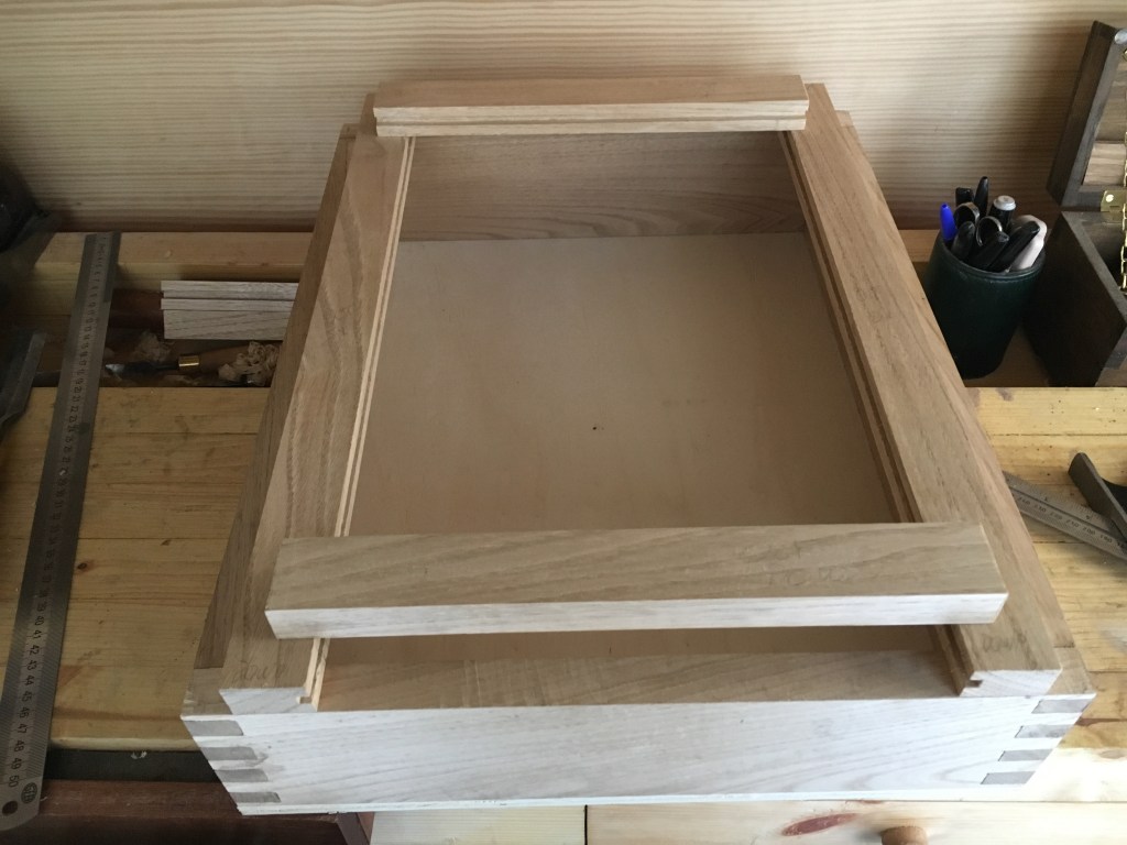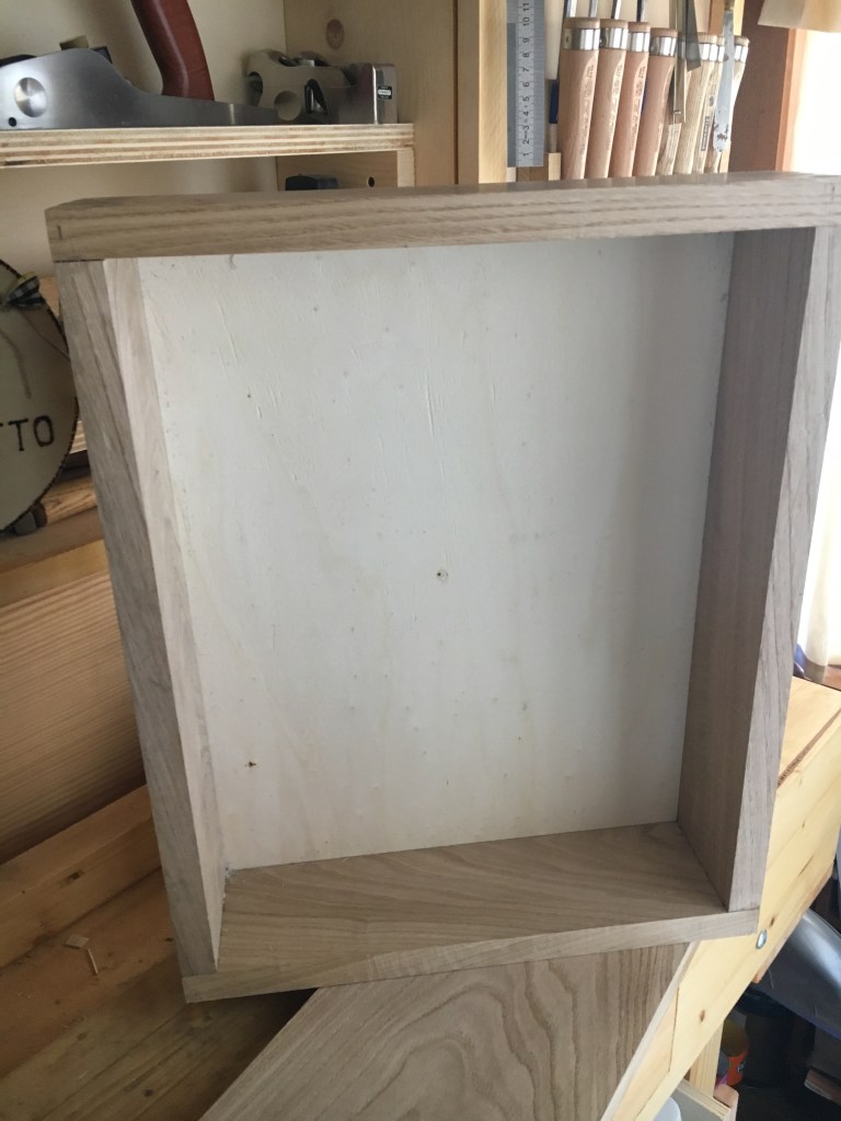 È un manufatto di qualche tempo fa. Si tratta di una piccola vetrina bacheca dotata di gancetti per appendere orologi ma potrebbe prestarsi anche come vetrina portachiavi. Può essere sia appesa al muro che appoggiata su un mobile in posizione capovolta ovviamente ruotando i gancetti. Realizzata in legno di castagno di spessore di circa 2 cm. e pannello posteriore in multistrato di pioppo di 1 cm. di spessore. La finitura è a olio e cera. Le misure esterne sono 50 cm. di altezza, 40 cm. di larghezza e 11 cm. di profondità. La vetrina è dotata di un sistema di illuminazione in modalità permanente / spenta / automatica ad apertura dell’anta. Gli incastri della carcassa sono a coda di rondine mentre quelli del telaio dello sportello a tenone e mortasa. Il vetro è di 4 mm. di spessore ed è inserito in un canale praticato nel telaio. Foderato con panno in velluto color bordeaux e munito di serratura con chiave e chiusura a gancetto. E’ stato un lavoro molto interessante in quanto mi ha dato modo di utilizzare molte delle tecniche viste fino ad adesso, Di seguito inserisco alcune foto della lavorazione, numerate in ordine sequenziale.