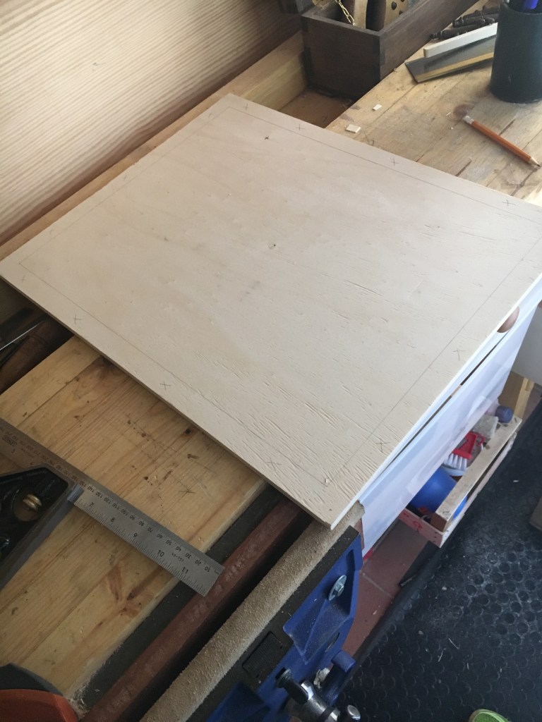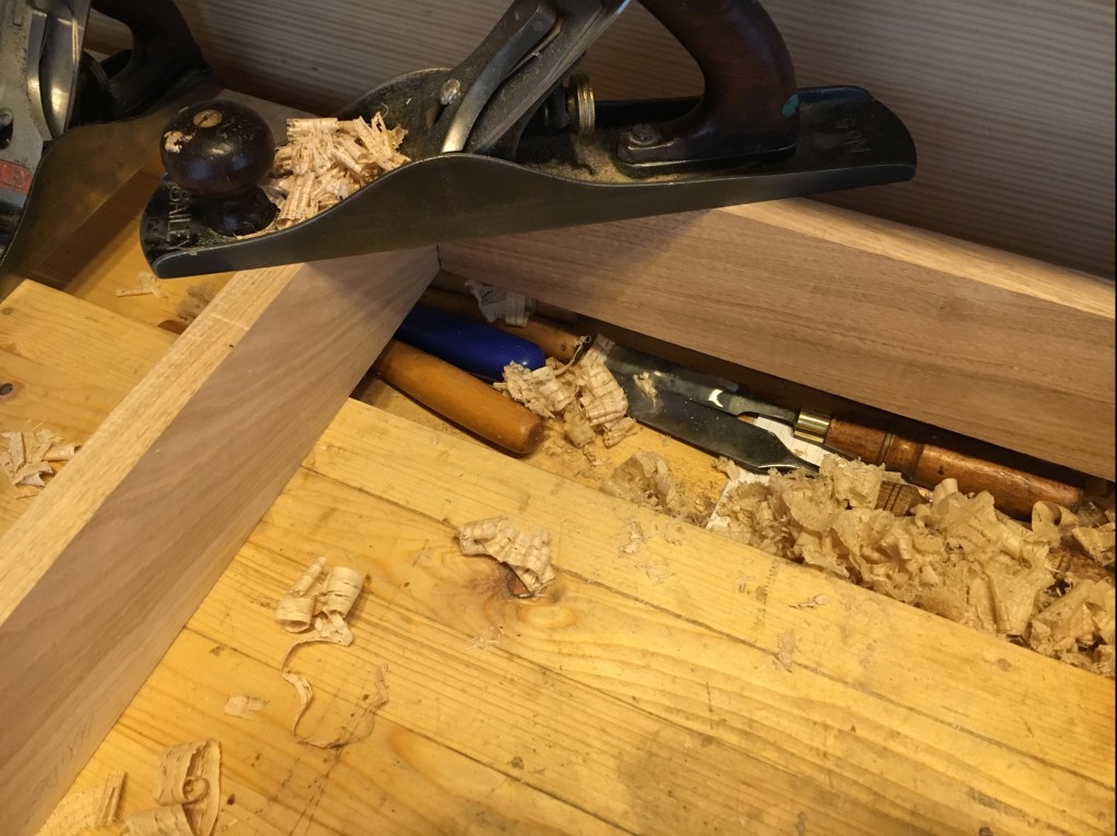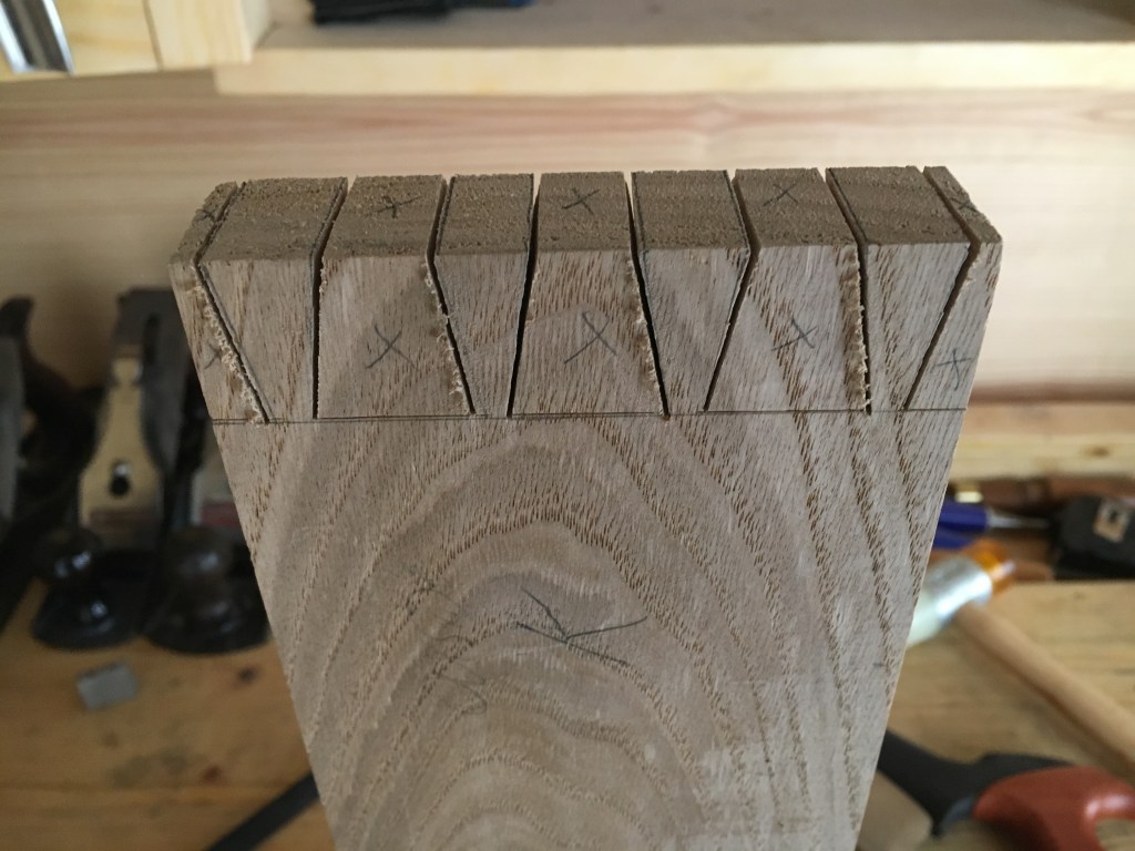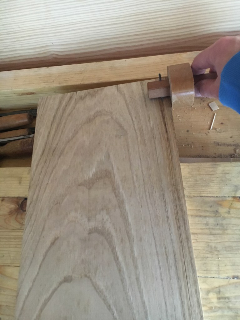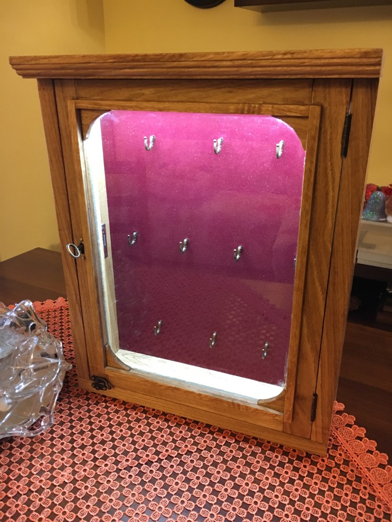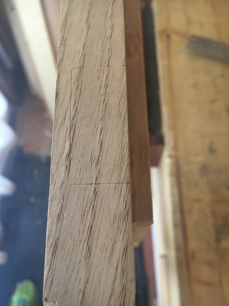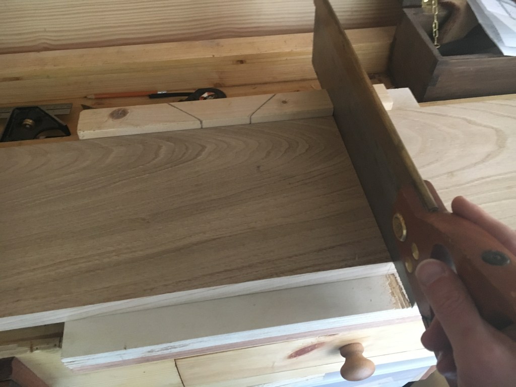 È un manufatto di qualche tempo fa. Si tratta di una piccola vetrina bacheca dotata di gancetti per appendere orologi ma potrebbe prestarsi anche come vetrina portachiavi. Può essere sia appesa al muro che appoggiata su un mobile in posizione capovolta ovviamente ruotando i gancetti. Realizzata in legno di castagno di spessore di circa 2 cm. e pannello posteriore in multistrato di pioppo di 1 cm. di spessore. La finitura è a olio e cera. Le misure esterne sono 50 cm. di altezza, 40 cm. di larghezza e 11 cm. di profondità. La vetrina è dotata di un sistema di illuminazione in modalità permanente / spenta / automatica ad apertura dell’anta. Gli incastri della carcassa sono a coda di rondine mentre quelli del telaio dello sportello a tenone e mortasa. Il vetro è di 4 mm. di spessore ed è inserito in un canale praticato nel telaio. Foderato con panno in velluto color bordeaux e munito di serratura con chiave e chiusura a gancetto. E’ stato un lavoro molto interessante in quanto mi ha dato modo di utilizzare molte delle tecniche viste fino ad adesso, Di seguito inserisco alcune foto della lavorazione, numerate in ordine sequenziale.