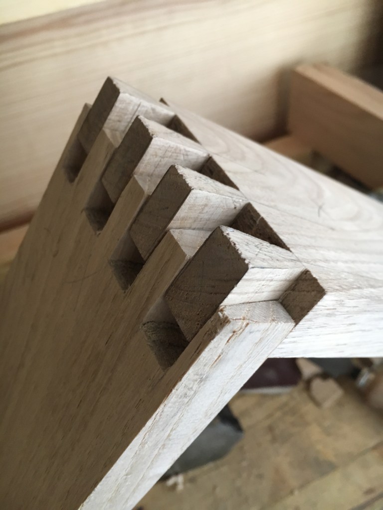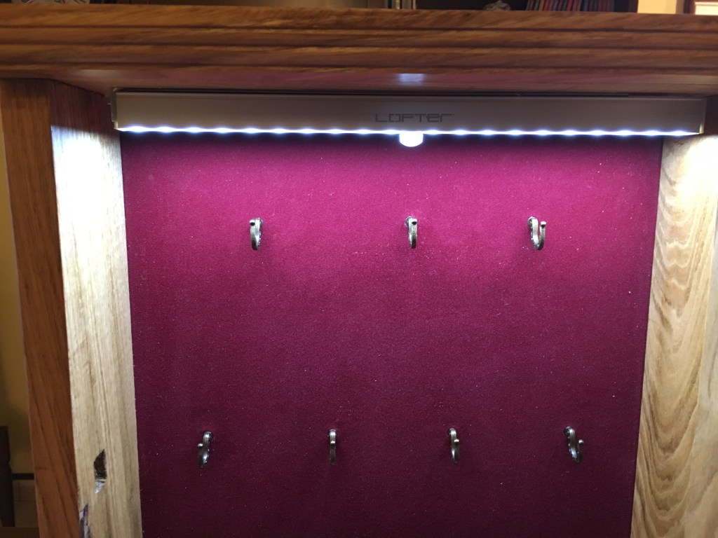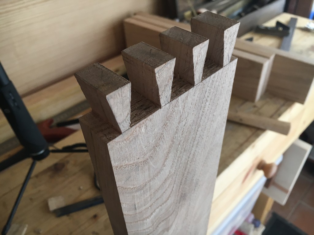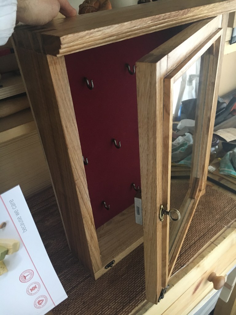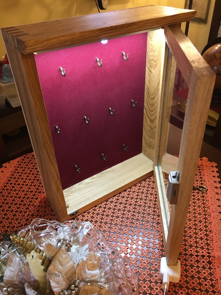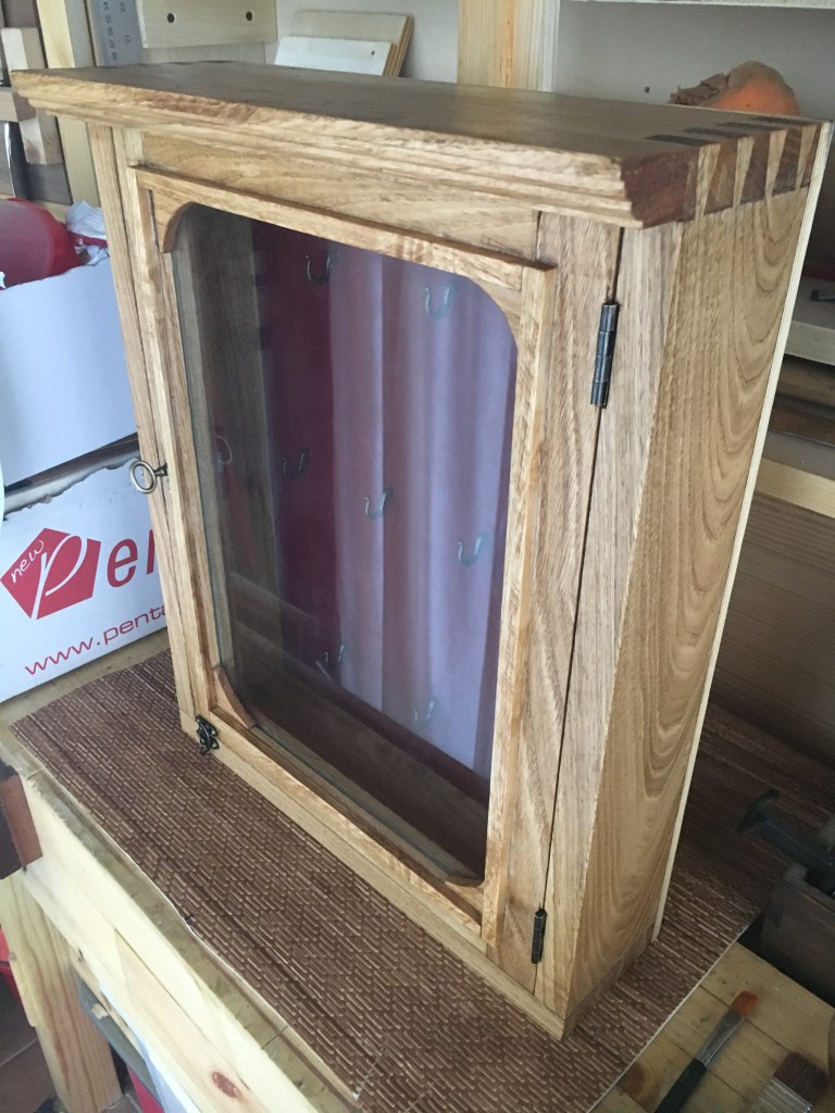It’ s a work from some time ago. It is a small showcase with hooks for hanging watches but it could also be used as a keychain showcase. It can be hung on the wall or placed on a piece of furniture in an inverted position by rotating the hooks. Made of chestnut wood of about 2 cm. thick and 1 cm. poplar plywood rear panel. The finish is with oil and wax. The overall measurements are 50 cm. high, 40 cm. wide and 11 cm. depth. The showcase is equipped with a lighting system in permanent / off / automatic mode when the door is opened. There are dovetail joints in the carcass while the door frame are mortise and tenon joints. The glass is 4 mm. thick and is inserted in a groove of the frame. Finished with a velvet cloth and fitted with key lock and hook closure. It was a very interesting work because I had the opportunity to practice with various techniques. Above I insert some photos of the work, numbered in sequential order.