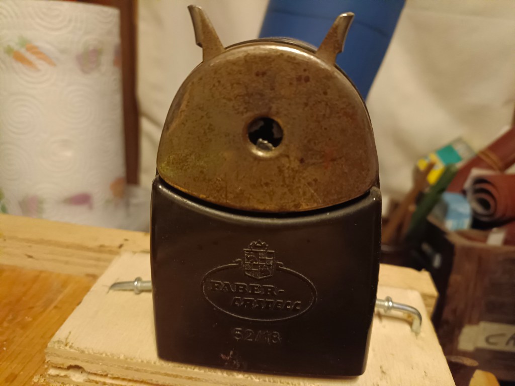 Only recently I have equipped myself with a vintage 1950s crank pencil sharpener marked Faber Castell model 52/18. It’s solid and works okay but doesn’t make perfect points like a new crank sharpener.