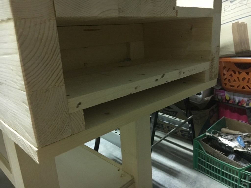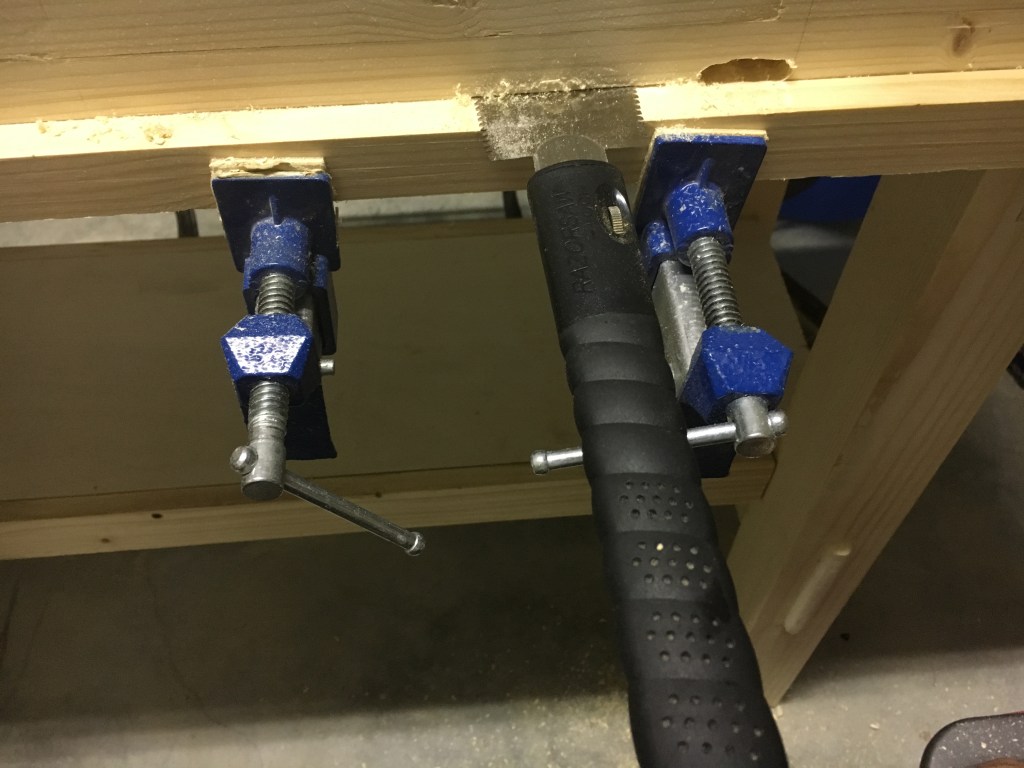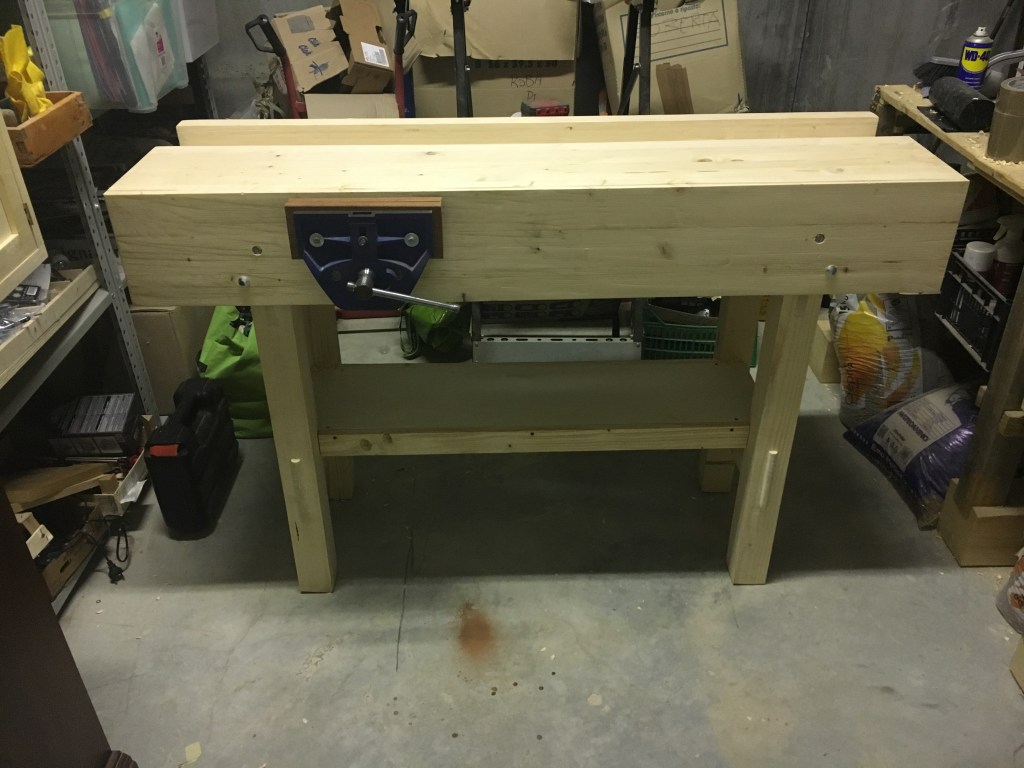 La seconda variazione è stata l’inserimento di un ripiano sotto il banco. Il ripiano può essere utilizzato per poggiare il legname oppure degli elettroutensili oppure, come nel mio caso, ospita vari pezzi di scarto raccolti in un contenitore ed una scatola con tutti i morsetti. Il ripiano offre il duplice vantaggio di conferire maggiore rigidità al banco e al contempo appesantirlo grazie al peso degli oggetti che é chiamato a sostenere. Il mio ripiano é stato realizzato con multistrato di 2 cm. di spessore (quindi molto robusto) ed è stato racchiuso in una cornice che a sua volta poggia ed é fissata per mezzo di viti ai traversi delle gambe del banco. Posso assicurare che il ripiano, nonostante i grossi carichi, si è comportato benissimo fino ad oggi non mostrando alcun cedimento.