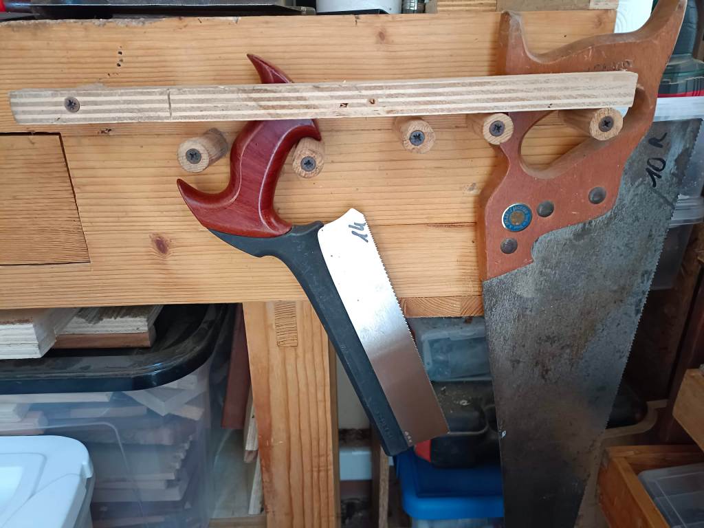Un’altra variazione consiste nell’inserimento di alcuni supporti sul frontale del banco nei quali poter riporre le seghe che utilizziamo maggiormente. L’ideale sarebbe metterci seghe piccole come le tenon saw e le dovetail saw ma niente vieta di metterci anche una sega più grande, come una panel saw, a patto che non crei intralcio durante la lavorazione. I supporti che ho realizzato sono dei semplici cilindri di legno nei quali ho praticato centralmente un foro ed inserito delle viti che li vincolano al banco. Una stecca frontale alzabile evita che le seghe possano scivolare via dai supporti. Avrei potuto anche sagomare i supporti così da adattarli precisamente alla misura del manico delle seghe, così come fatto da Paul Sellers, ma volevo un qualcosa di più generico ed adattabile alle mie necessità e questi cilindri mi sono sembrati un buon compromesso.