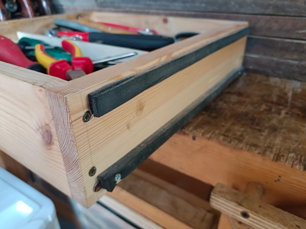 The rear panel of the drawer is fixed to the sides with screws while the bottom of the drawer, in OSB, has been inserted into the groove obtained in the elements of the drawer. Once the drawer was made, I planed the front and sides until it could slide freely and smoothly.